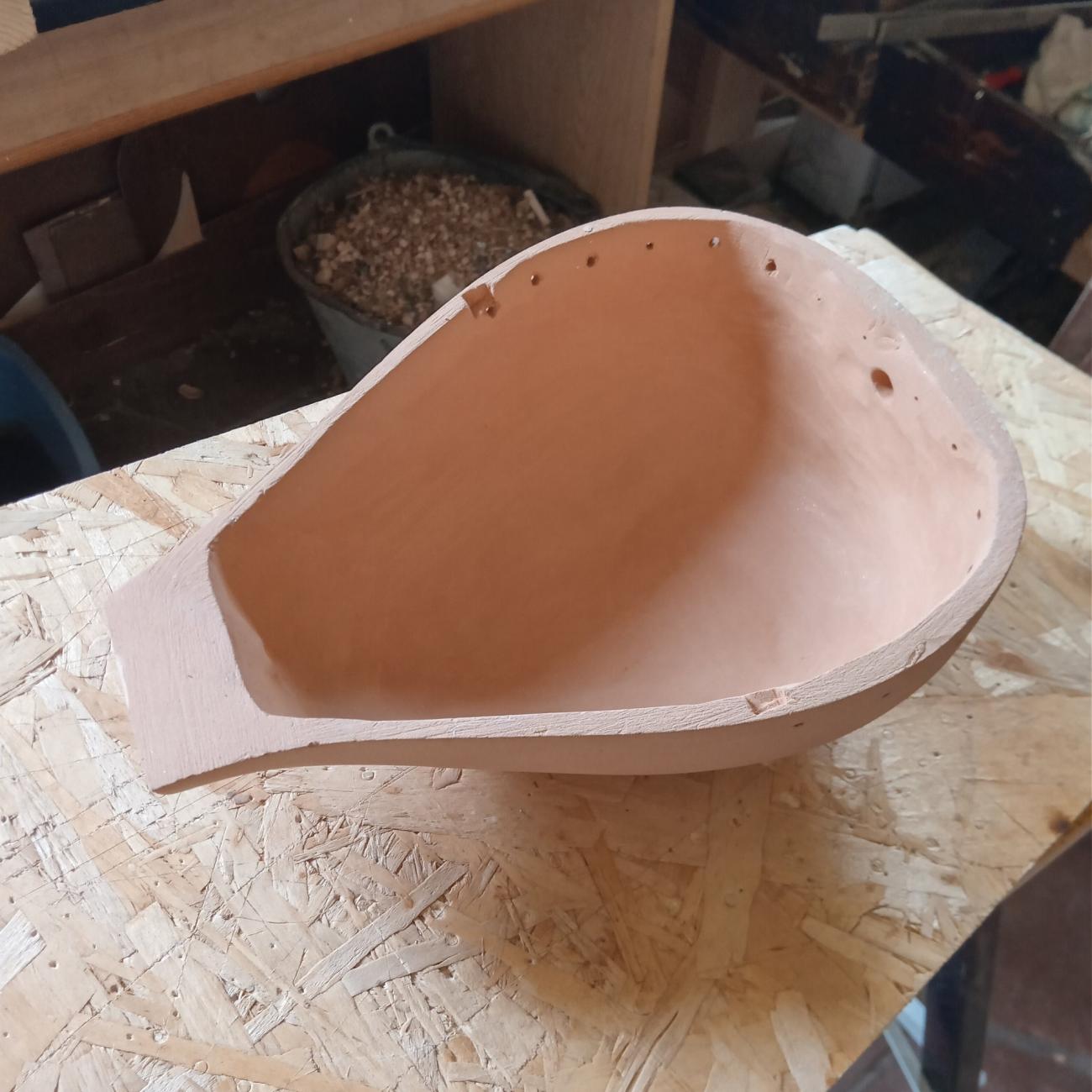A plaster mould is made using the body of one of the monoxylous rababs. Inside this mold, the body of the instrument is shaped using grey sedimentary clay typically used for making vases and other objects, aiming for a uniform thickness not exceeding 4 mm. Holes are made to accommodate the string holder peg, the wooden neck pin, the holes for attaching the leather, and the metal band. Once dry, the body is extracted from the mold and smoothed with abrasives (See Figure 20). The piece is then fired, painted with the only three colours used at the time: ochre, brown, and green, except in the areas to be glued to the leather soundboard and the neck. After applying a coat of glaze, it is fired a second time, and the piece is finished. At this point, the spruce neck is glued, using animal hide glue, secured with a beech pin into the terracotta heel. The joint is reinforced from above by the olive wood fingerboard. A wooden crossbar is fixed inside the body to support the straight edge of the leather, which is glued using animal hide glue and wooden pegs that are then cut off (See Figure 21).