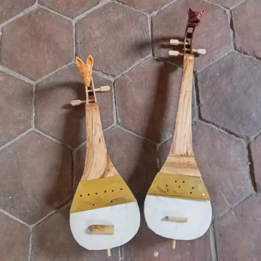 The sound of the lutes carved from date palm wood, with leather soundboards and silk and gut strings, is harmonious and enchanting, markedly different from the modern Oriental oud with its nylon and metal-wound guitar strings. The monoxylous cedar wood rabāb have a sweeter sound compared to those with ceramic bodies, whose sound is very lively and bright when plucked, with a faster attack transient and higher volume than the wooden ones when played with the bow.