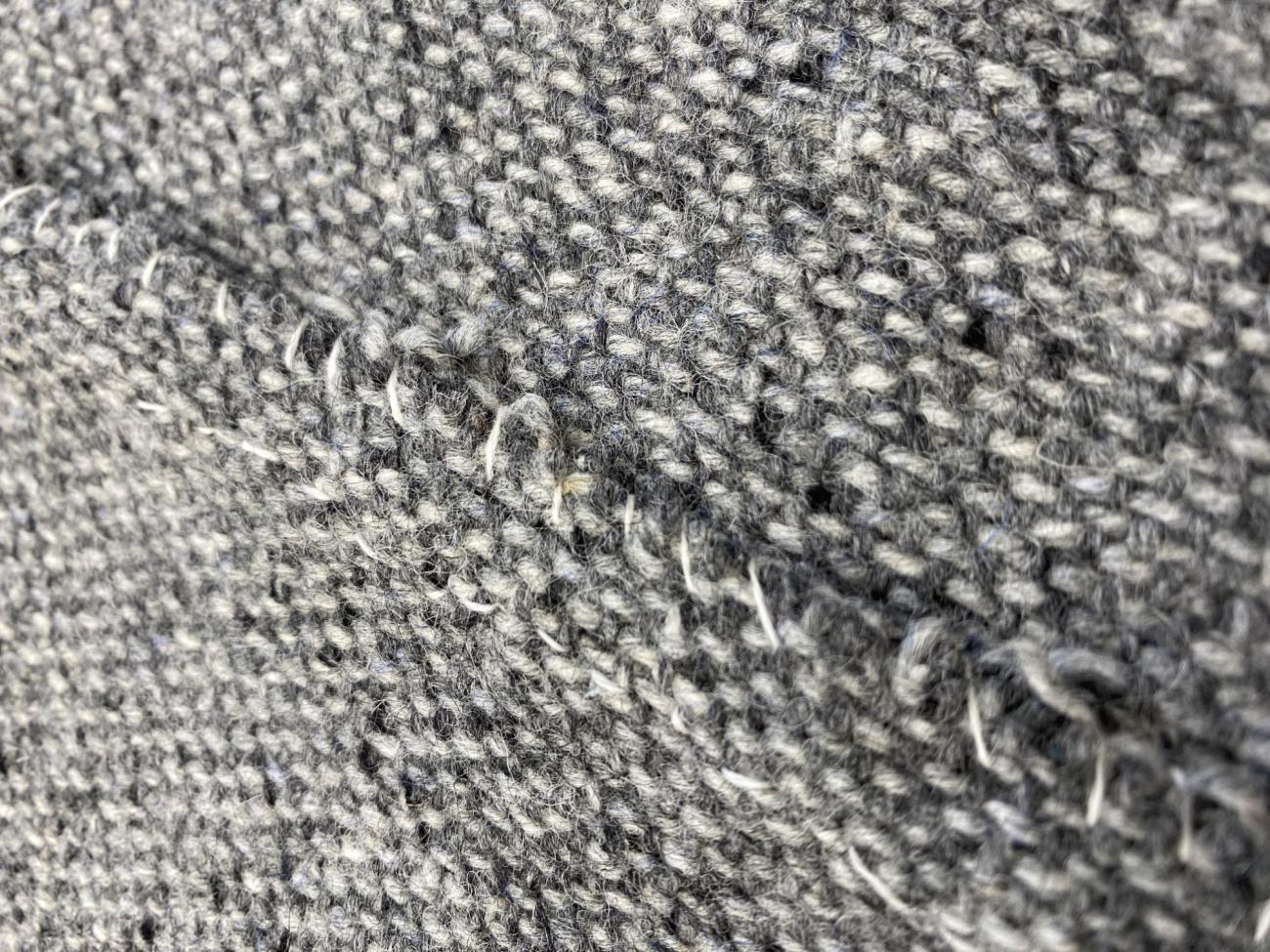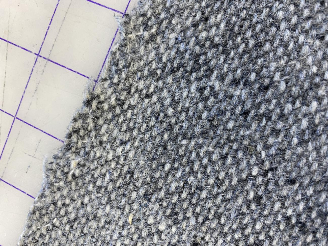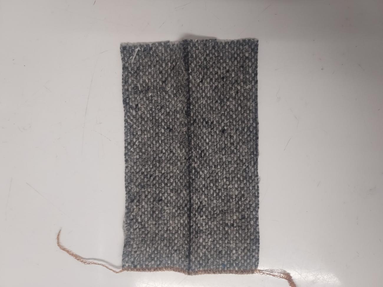 For our fabric we wanted 100% wool with a loose weave to replicate the medieval fabric. Pure wool acts in a distinct way that synthetic blended fabrics do not, and tightness of weave affects seam finishing techniques and the rate at which the fabric ravels. We used a tweed twill from Kerry Woolen Mills in Ireland, which, while slightly thicker in weave than the four shaft-twill found in most of the Herjolfsnes garments (5-6 warp threads per cm versus 8-10 per cm) it was the best approximation that we could find based on our criteria, short of weaving our own (Fransen, Nørgaard and ĂstergĂĽrd, 2011, p. 88; Sanchez, 2023).