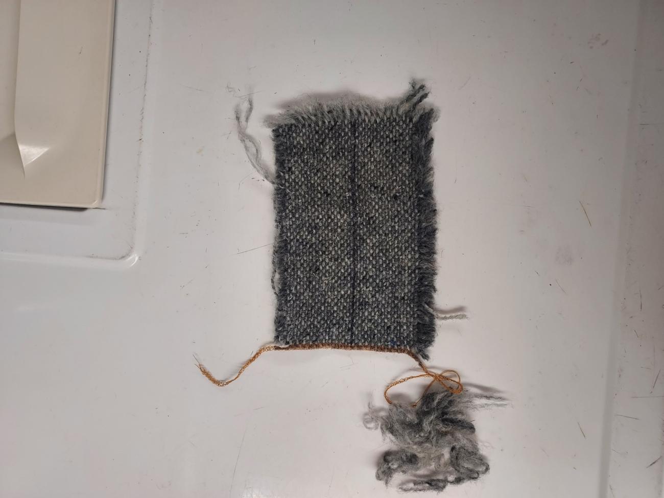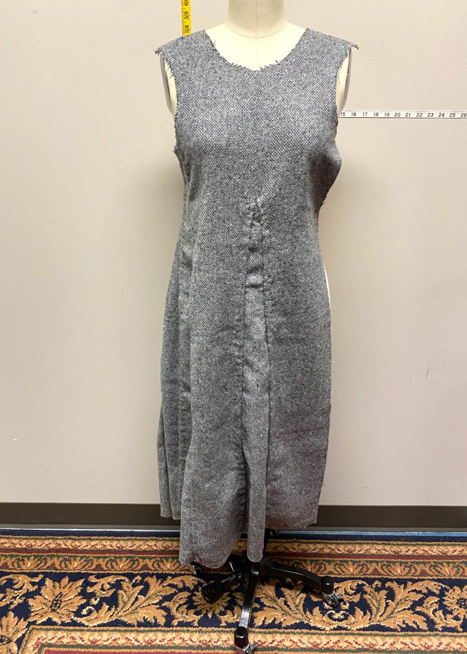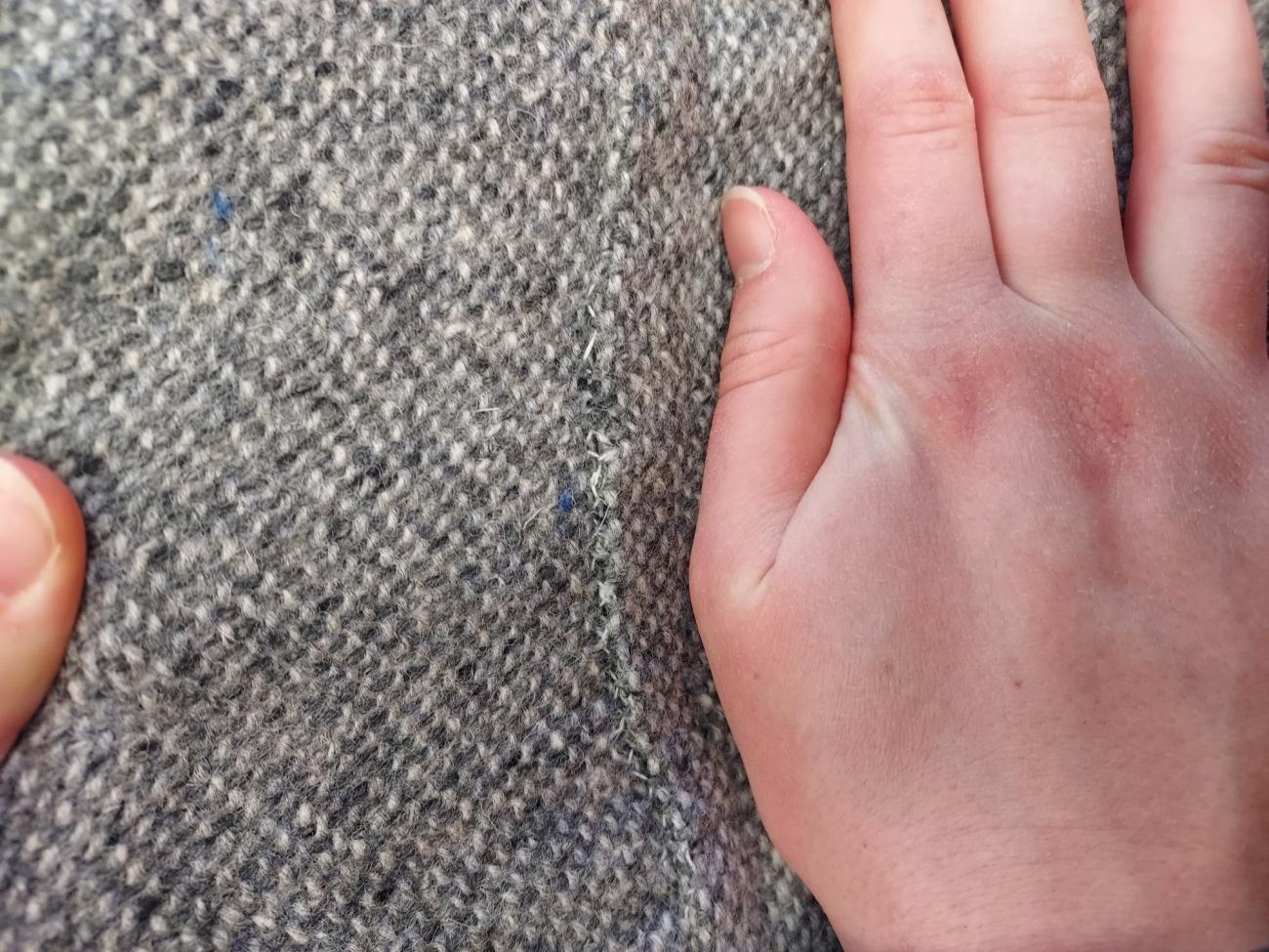 For our fabric we wanted 100% wool with a loose weave to replicate the medieval fabric. Pure wool acts in a distinct way that synthetic blended fabrics do not, and tightness of weave affects seam finishing techniques and the rate at which the fabric ravels. We used a tweed twill from Kerry Woolen Mills in Ireland, which, while slightly thicker in weave than the four shaft-twill found in most of the Herjolfsnes garments (5-6 warp threads per cm versus 8-10 per cm) it was the best approximation that we could find based on our criteria, short of weaving our own (Fransen, Nørgaard and ĂstergĂĽrd, 2011, p. 88; Sanchez, 2023).
