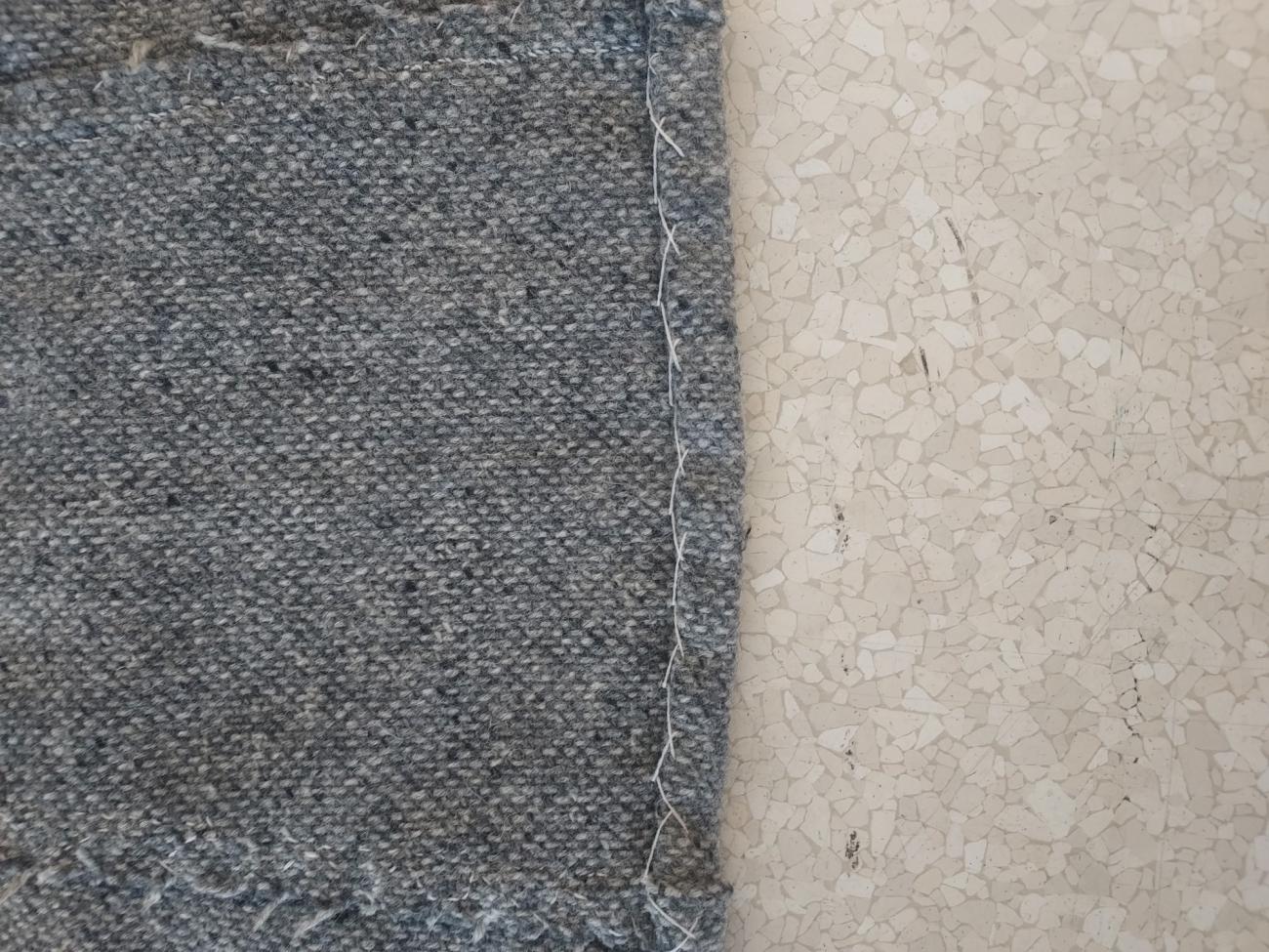 We found sewing the singling onto the garment to be an intuitive and simple process. We eyeballed the seam allowance instead of measuring precisely, as it is more efficient and just as practical since the singling gets incorporated flat into the fabric. We stitched from the wrong side, that is with the wrong side up, as that is the side with larger and more visible stitches. This effectively secured the individual threads to each other and made it difficult for the fabric to fray out in large quantities. In some ways this was like pre-emptive darning as we sewed the weave of the fabric together so that it held to itself.