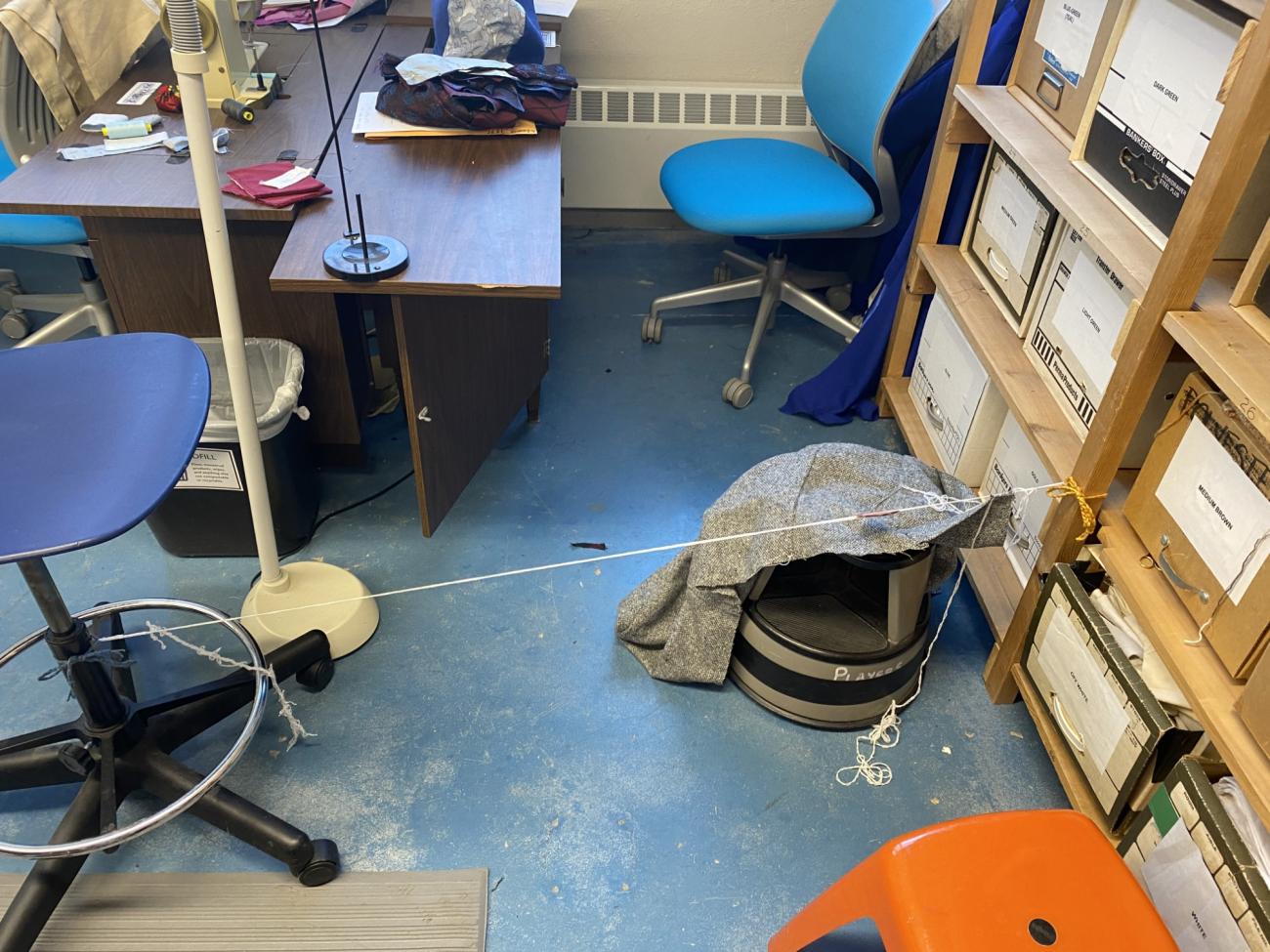 Enclosing the raw edges in tablet weaving was the technique which took the most time to learn.6 Though we had done a few practice samples previously to make sure we had an idea of what we were doing, it took a while to get the hang of managing it on a full garment. Once we had made the cards (See Figure 16), we needed to set up our "mini loom". Based on extant images, as well as Peter Collingwood's ethnographic research, the warp is tied off on either end, either to a sturdy object or a person (Collingwood, 2015, p. 26). The Virgin Mary is often depicted engaging in wool work in the medieval period, and a French book of hours from the fifteenth century shows her manipulating the cards as she tablet-weaves thread which she has suspended between two poles (See Figure 17). This image helped us get a sense of how to set up our "mini loom." For our purposes, we tied one end off to a set of shelves, and the other end to a chair that could be moved backwards to create tension on the warp. Fransen et al. describes the warp as three-strand, which we took to mean three individual cards (Fransen, Nørgaard and ĂstergĂĽrd, 2011, p. 32). In each card we passed about twice the length of the hem through each of two diagonal holes. We then repeated this process on two more cards. In total this left us with six warp threads, which is consistent with the six-thread twist that is described on a variety of the garments that were found with the dress we are recreating (Fransen, Nørgaard and ĂstergĂĽrd, 2011, p.36). From here we slip knotted all the threads together on either side of the warp and passed a braided length of yarn through these knots which was then secured to the shelves and chair (See Figure 18). This left us with our warp.