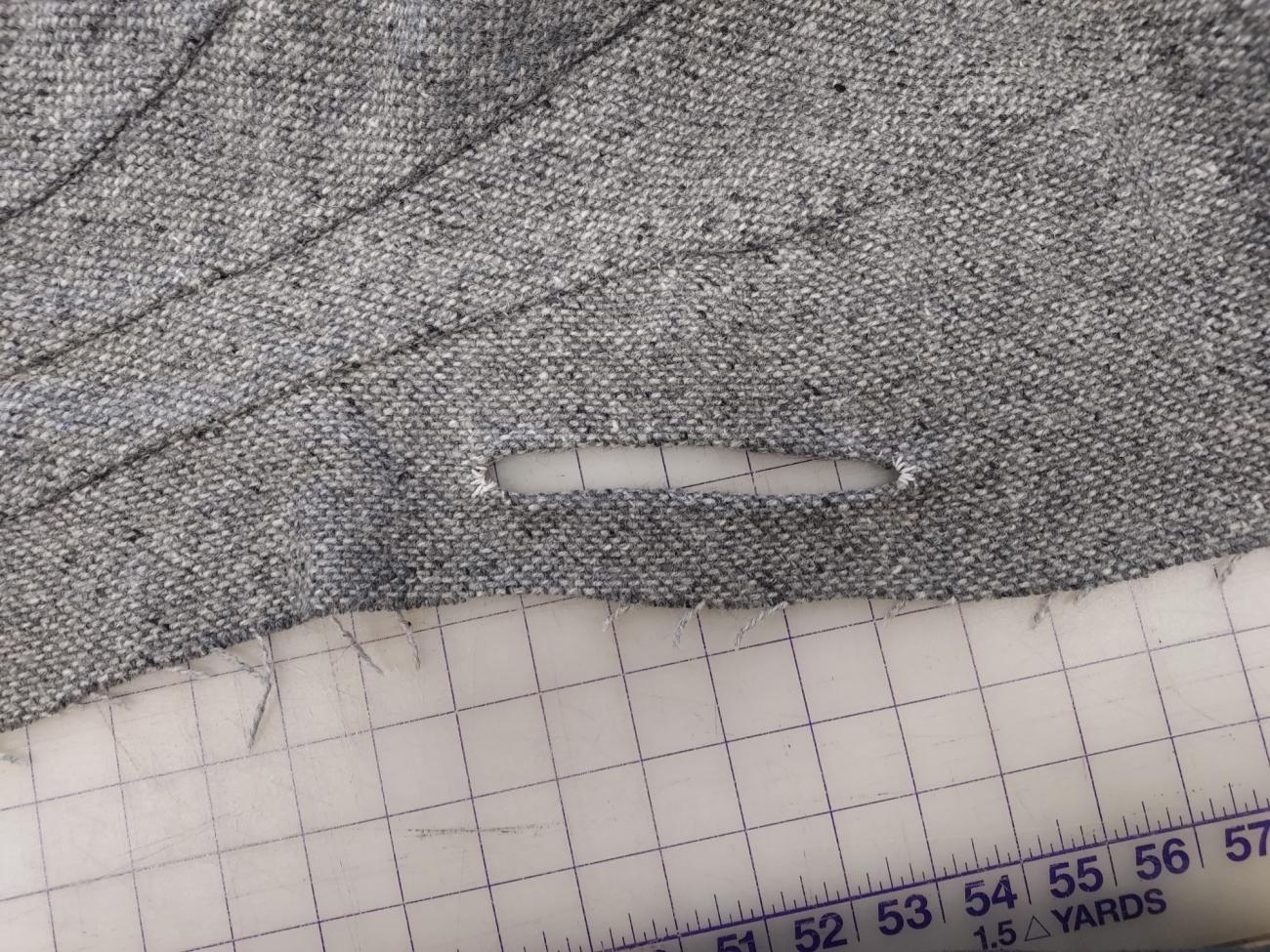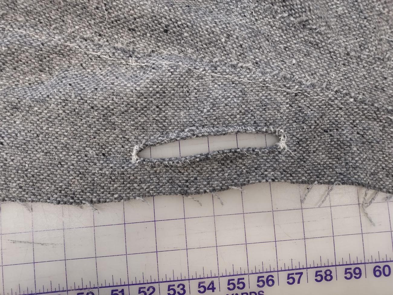 For the pocket on the modern side, we cut the slit in the fabric as marked on the pattern. We then turned both sides back to the inside of the garment about 0.64 cm. We tapered this down to nothing on either end of the pocket slit to avoid awkward pulling and having to cut into the fabric more than necessary. The turned back fabric was then stitched down using the same overcast stitch that was used to finish the seams. Since this left the ends of the pocket slits as raw edges, we used a buttonhole stitch to cover and protect that part of the fabric (See Figure 22).