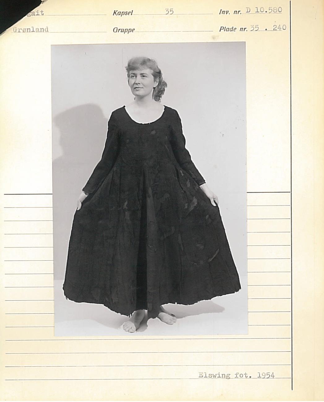 Fig 1. Image of Woman Wearing Herjolfsnes Garment. From The National. Museum of Denmark, Copenhagen, Denmark, ca. 1954. D10580. Ikigaat., Grønland. https://samlinger.natmus.dk/dmr/asset/213050.