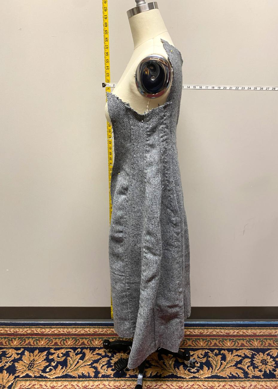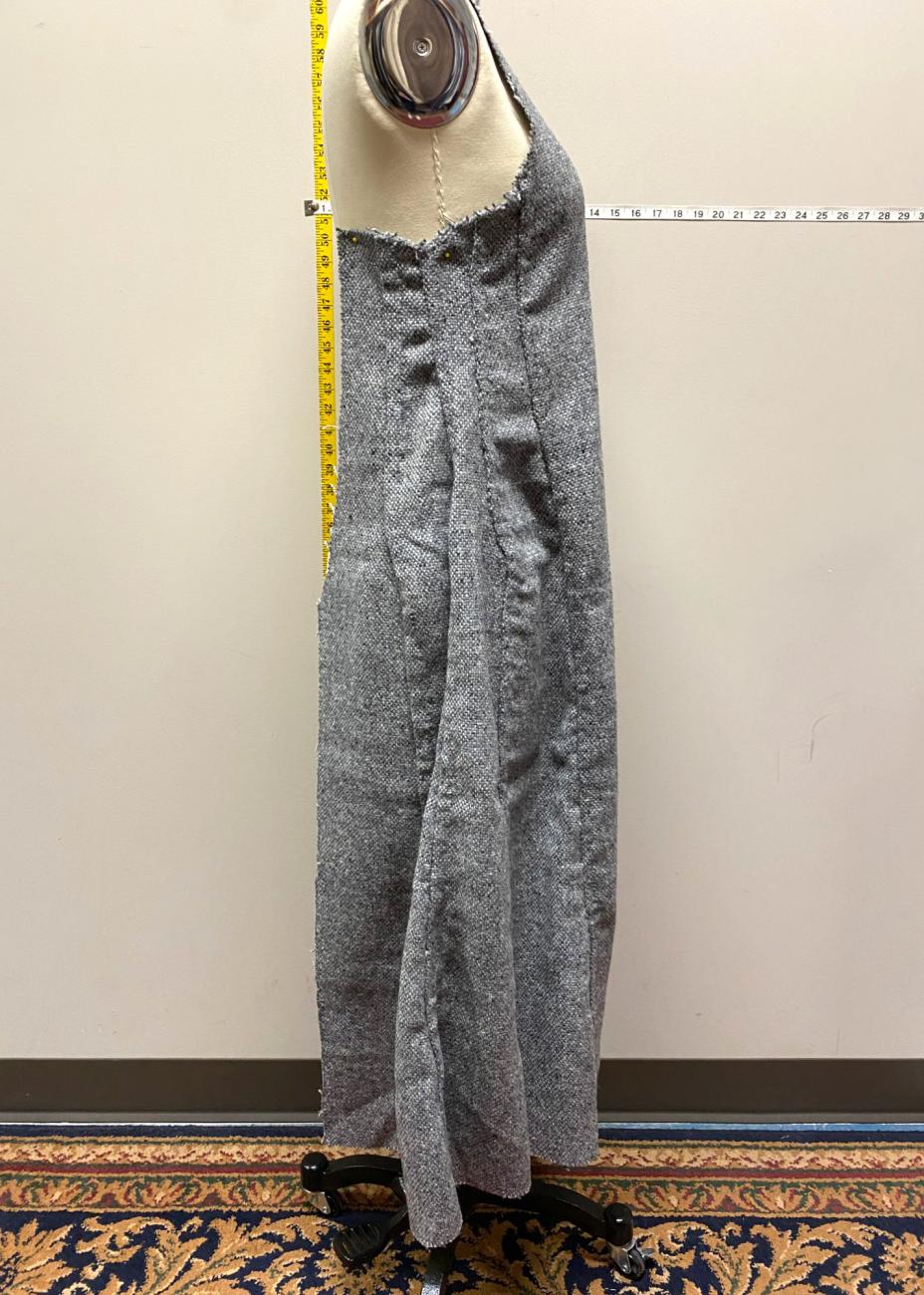 We then scaled this grid up one pattern piece at a time onto large sheets of paper to make the final pattern (See Figure 3). To test the pattern before continuing, we created a muslin test garment. As the pattern pieces did not include seam allowance, we added 1.25 cm to the edges of the garment and then sewed along the stitch lines that were marked from the edges of the pattern pieces using a machine. There were aspects of the pattern that were concerning to our modern sewing sensibilities, including the lack of closure or darts to allow room at the bust, but the muslin garment showed that the gored design provided plenty of ease and room for movement.