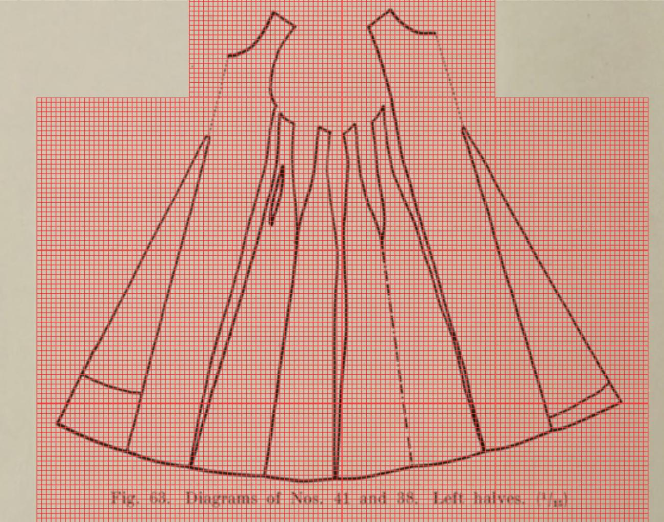 To begin the patterning process, we measured Beckerâs shoulder width with her arms raised as this circumference is the widest point of the body and affects the garment's ability to be taken on and off. This measurement came to 92.71 cm (36.5 in) and so we aimed for a final waist measurement of approximately 96.52 cm (38 in) to account for ease, small measurements of extra space added to allow for movement, a better fit. We identified the waist of the pattern pieces as the smallest point, and we electronically overlaid a grid onto the line drawings of Herjolfsnes garment 38 using Canva (See Figure 2). This grid was proportioned so that each square on the grid aligned to 1.25 cm (½ in) on the final pattern. To ensure that the waist curve was as close as we could come to the target measurements, the grid was first positioned along the waist and then expanded to cover the entire garment. This size grid allowed for precision across the differently sized pieces, kept them all in proportion to each other, and allowed them to be transferred to a full-sized pattern.