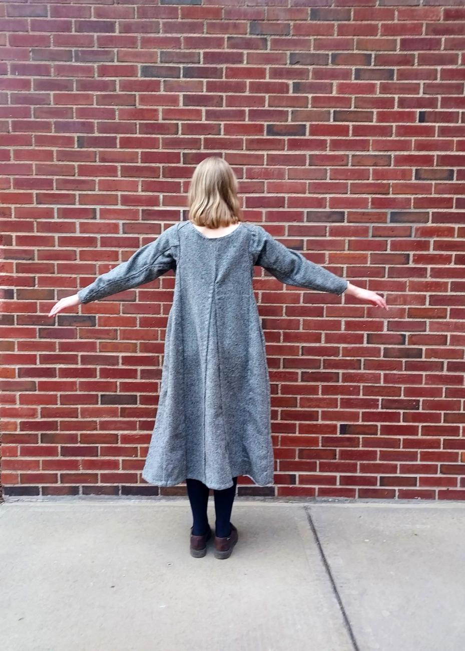 Trying on the test garment also allowed us to consider whether to further alter the pattern by lengthening it or to keep it in proportion with the original measurements. Becker is taller (170 cm) than the person on whom the garment was found (140 to 147 cm) and scaling the pattern up proportionally to the waist did not fully account for this height difference (Nørlund, 1924, p. 100). We considered lengthening the garment to be of similar length to what it would have been on the person it was found on, but we decided against it because we valued preserving the original proportions more than making it fall at a similar length on Becker as on its original owner.