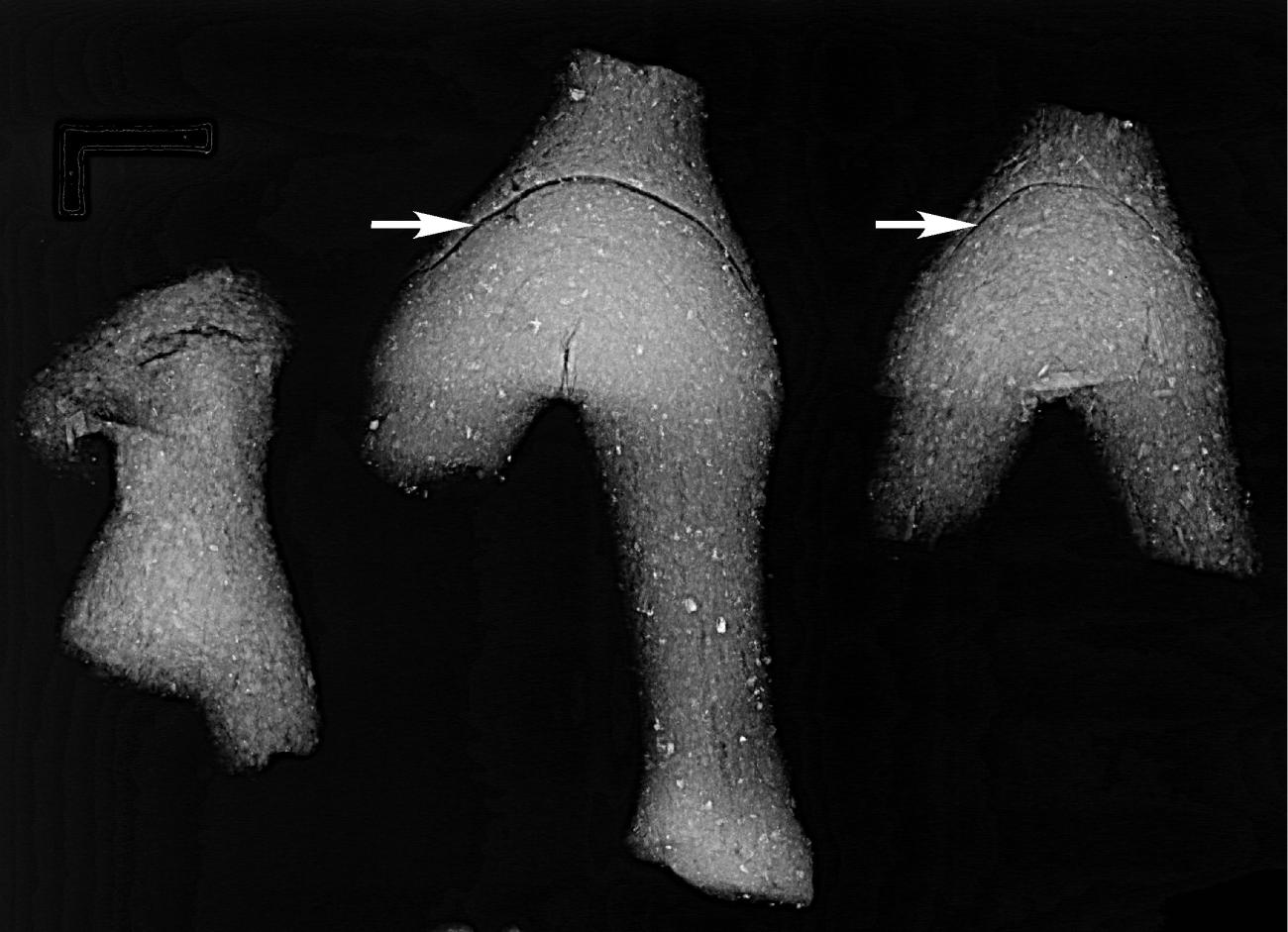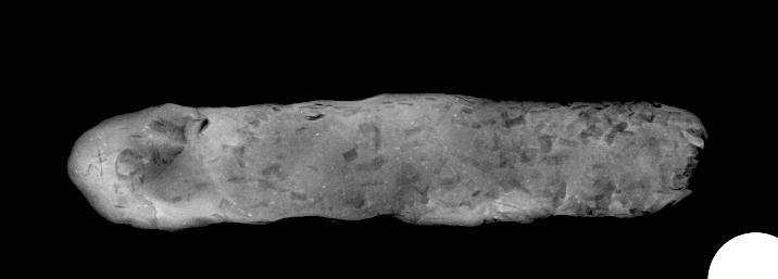 The top-down X-ray view of the simple tablet shows a random orientation of the straw inclusions and a parallel alignment to the surface for the side view (See Figures 14-15). This is entirely in line with what we would expect based on our knowledge of pottery-forming techniques. The physical pressures exerted when making a tablet are similar to mould-made or pinched pots, which show an equivalent orientation in X-rays (See Figure 1). The top-down view of the folded tablet also shows a random orientation of the straw inclusions. Unfortunately, the side view is difficult to interpret due to the various folding layers (See Figures 16-17).