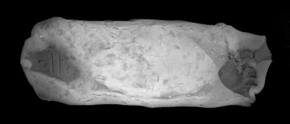 As expected, the existence of string and knot is clearly visible on the X-rays (and would be equally visible if the string had burnt out from exposure to fire and had left a void behind) (See Figures 5-6, 21-22). The frequency of knotting is hard to discern and it impossible to distinguish double knots from single knots. Twisted string can be visualised satisfactorily. Thus, the experiments have shown the potential of X-radiography in revealing the 'content' of intact hanging nodules.