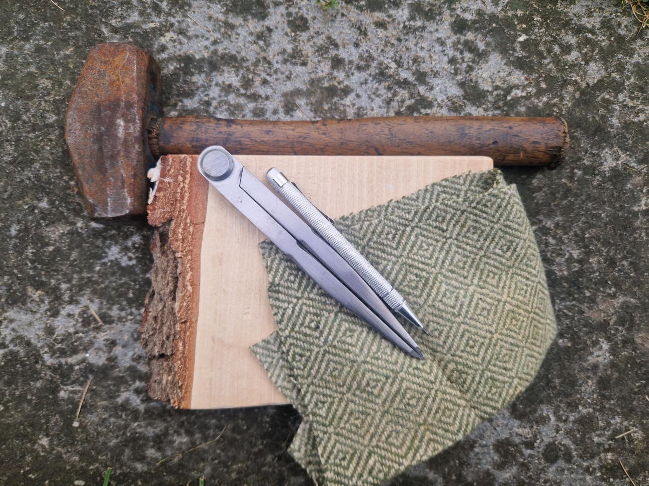 The initial experience of producing bracteate matrices from wood, was that the minute details are limiting the types of tools that can effectively be used, at least in the production of this specific bracteate. After attempting to use small scalpels, V-irons, and scrapers it was concluded that the best result would be gained by simply using a tool with a sharp tip to gradually scrape the lines on the surface. Even small errors will cause a distortion in the surface of the bracteate; thus, it is important to be patient and take uttermost care to achieve a crisp and clear motif. A characteristic of working on wood is that it moves, which means that after making some line or dot, it will change in form when you make another line or dot next to it. This makes spacing between details and going back over old details to redo them important, as they would otherwise deform and not show up clearly on the bracteate. When transferring the motif onto the copper sheet, the wooden matrix was placed on top of an anvil, the sheet was place over the matrix and 8 layers of diamond cubic woolen cloth were placed on top, then struck repeatedly with a hammer to press the sheet down into the matrix and transfer the motif. In Figure 2 an image of the tools used can be seen. The compass was used both to make the initial circles as well as a scraper. While using the sharp points of the compass worked to achieve the results in this study, more suitable tools would be needed for higher quality bracteates. The round punch-tool was used to stamp the dots between the outer circles.