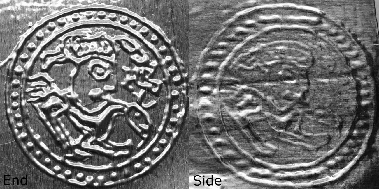 End wood is harder than side wood. This, it turned out, had major impact on the results, which can be seen in Figure 3. Initially it appeared better to work the side wood as it was easier to form and make a deeper relief. However, this softness also makes the wood yield under the hammering, making for a poor transfer of the motif. In addition, as the grains going along the side of the wood is of uneven hardness, it makes for a strong wavy pattern on the surface of the bracteate when struck. With these two factors combined, the poor transfer and the creation of noise makes using birch side wood unsuitable as matrix anvil matrices in the production of gold bracteates. The end wood however, due to its hardness and unity, was more difficult to work initially as it required more effort to achieve sufficient depth in the relief on the surface. The transfer, however, was vastly superior to that of side wood. Due to its hardness the end wood produces much improved quality with sharper and crisper details, and virtually no artifacts from the structure of the wood itself.