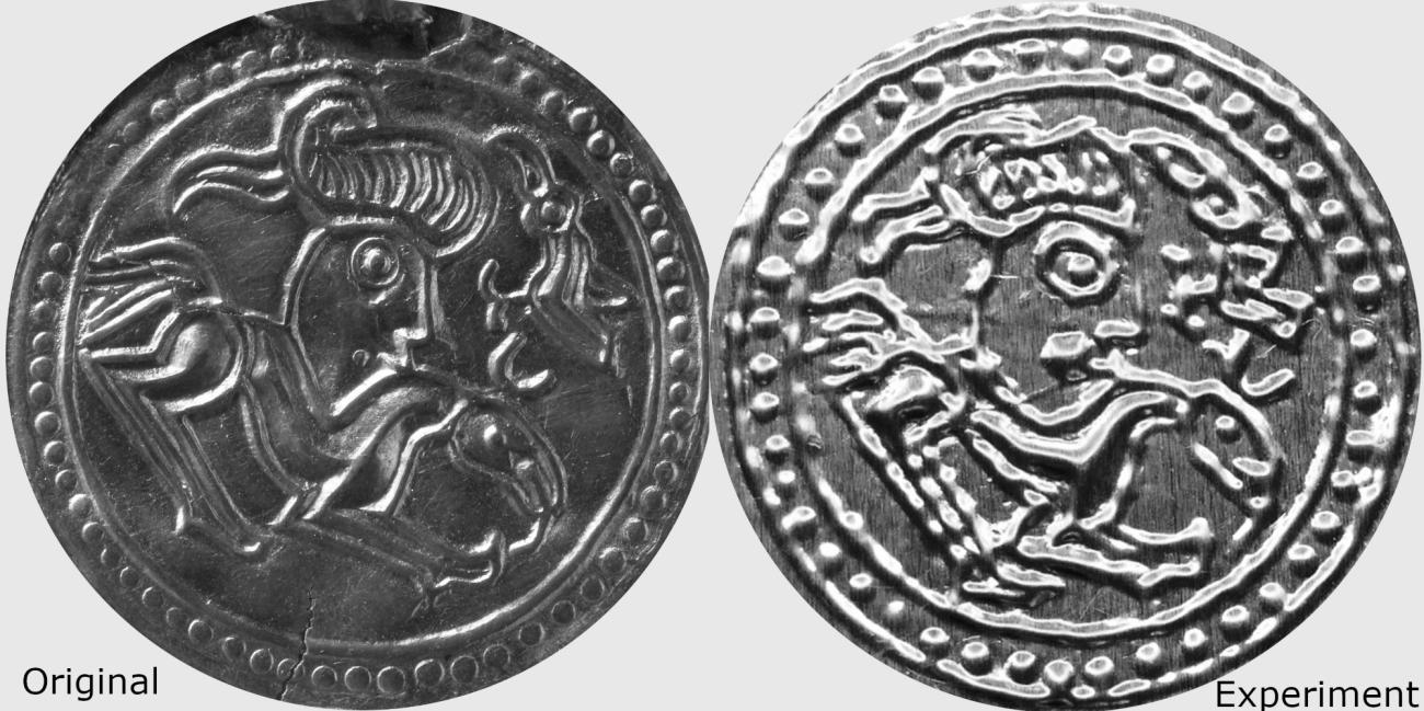 Gold bracteates are a type of jewelry, most likely worn around the neck as a pendant, which occurred in northern Europe during the migration period. They are made of a thin gold sheet which has been embossed with a motif, and usually but not always strengthened and adorned with a rim of gold wire thicker than the sheet itself. A gold loop is fastened on top of the bracteate to allow it to be worn in a necklace, or similar application. Most of the research on the field is devoted to the study of typology (for example Axboe, 1981 or Pesch, 2007), iconography (such as Pedersen, 2021 or Pesch, 2018) or chronology (see Axboe 2004; 2007; 2011). The method by which migration age gold bracteates were produced, while not as commonly the object of academic research, has still been greatly discussed. In 1895, Salin (1895) considered the possibility that both metals and organic material were used in the production of bracteates. He suggested that metal matrices were used to produce bracteates with a low relief, while organic material had been used for the bracteates with a bolder relief. The very first experiments were not conducted until half a century later when Mackprang (1952) showed how production could be done with bronze matrices. The conclusion of their experiment was that bracteates were struck with the gold plate placed on top of a matrix of negative relief and with lead or wood placed between the hammer and plate, thus creating the image or pattern in the relief. This method, known as pressblech (Coatsworth and Pindler, 2002), would then distribute the force of the hammer's blow to ensure a more consistent push of the gold into the shapes of the matrix. This was evident, according to the authors, due to the visible traces on the backside of the bracteate which were interpreted as the year-rings of the wood placed between the hammer and the gold plate. The argument has been made, however, that these traces are not from wood, but from cloth (Axboe, 2004). Indeed, it has been argued that the irregularities and patterns found in the visible traces are consistent with cloth but not with wood (Axboe, 2004). Axboe (2004) suggests that organic material is likely to have been used in bracteate construction, suggesting possibilities such as wood, walrus ivory, bone, and clay. In some instances, marks that are best explained by organic materials have been found on the surfaces of bracteates. According to Axboe (2004), wood would likely have been used as the matrix in cases where only a single, or few, bracteates were requested, but for a longer series of 10 or more bracteates, he points to Bohlin's (1981) suggestion of using other softer material, which could also include wood, as an intermediary medium before casting the final die in bronze. An experiment by Arrhenius (1975) using clay matrices to make bracteates has been criticized by Axboe (1982) who questions the validity of this theory. He points to the major decline in quality when making several bracteates from the same matrix, making serial production of even a few bracteates an impossibility at the required quality.