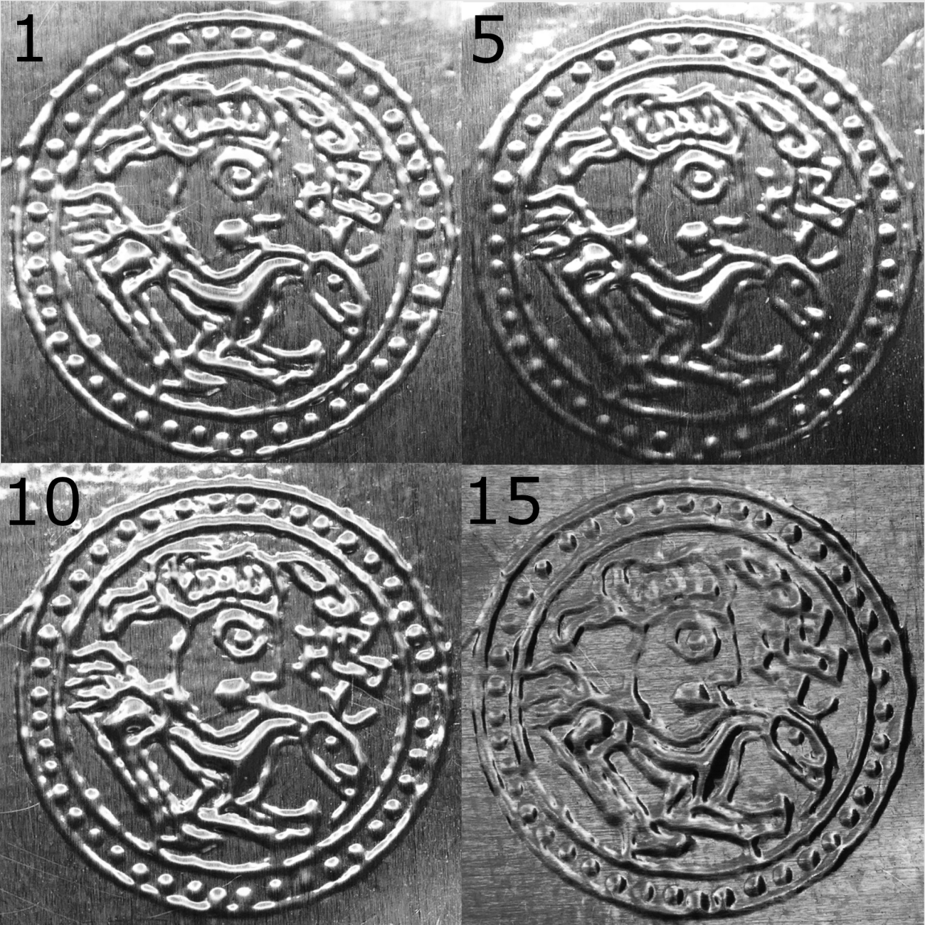 The investigation of the 15 bracteates that was made during this study, in which a high-resolution surface photographs were analyzed using computer enhancement, did not reveal any artifact, lines or otherwise that were persistent in nature and thus indicative of damage such as cracking of the matrix. In Figure 6, bracteate nr 1, 5, 10, and 15 can be seen, with no discernible damage occurring throughout. This shows that, while damage or cracking of a wooden matrix will occur in some cases, it is by no means an absolute necessity. Even under the stress of producing 15 bracteates, which exceeds any known series of bracteates, the matrix was able to endure without any major damage.