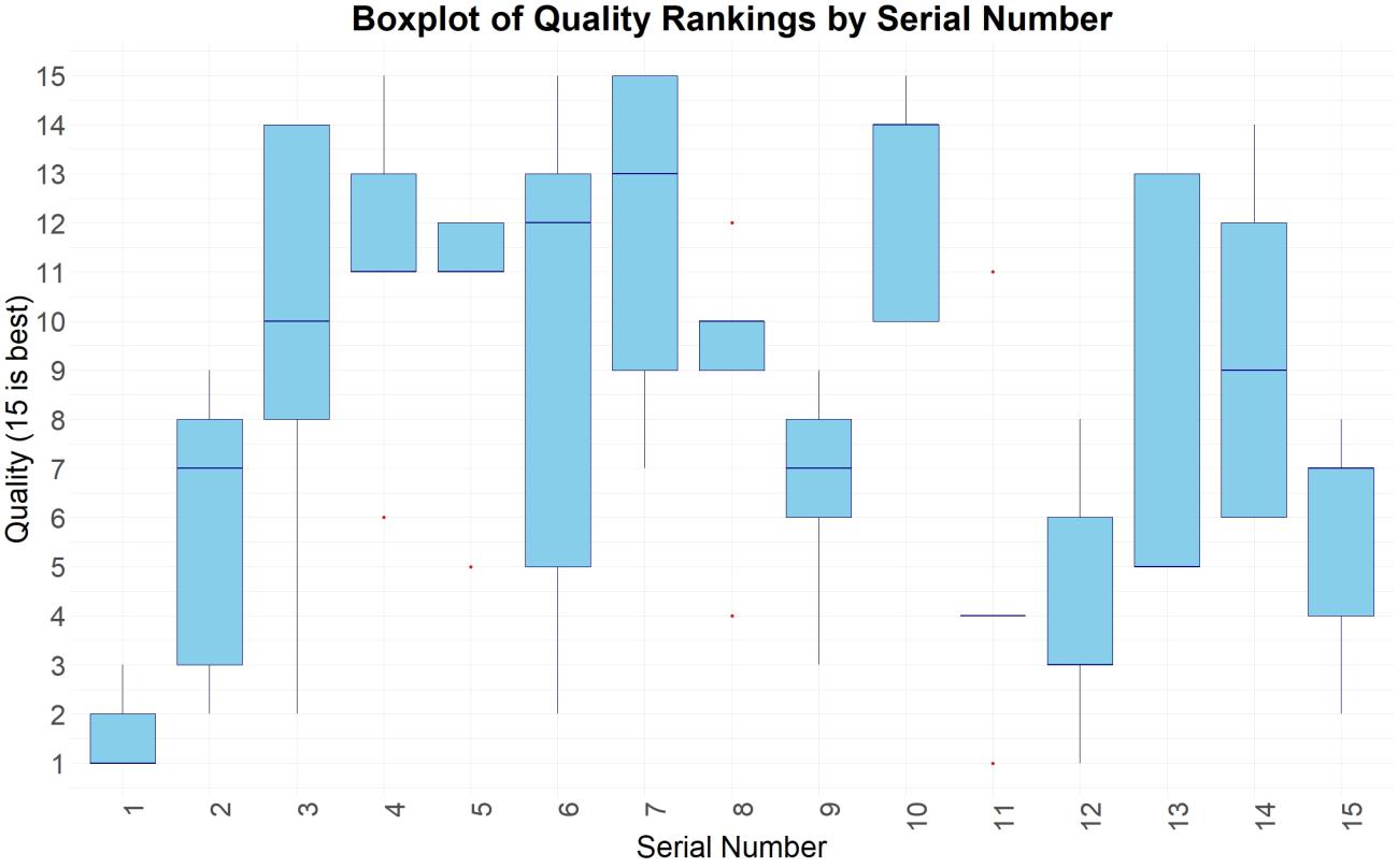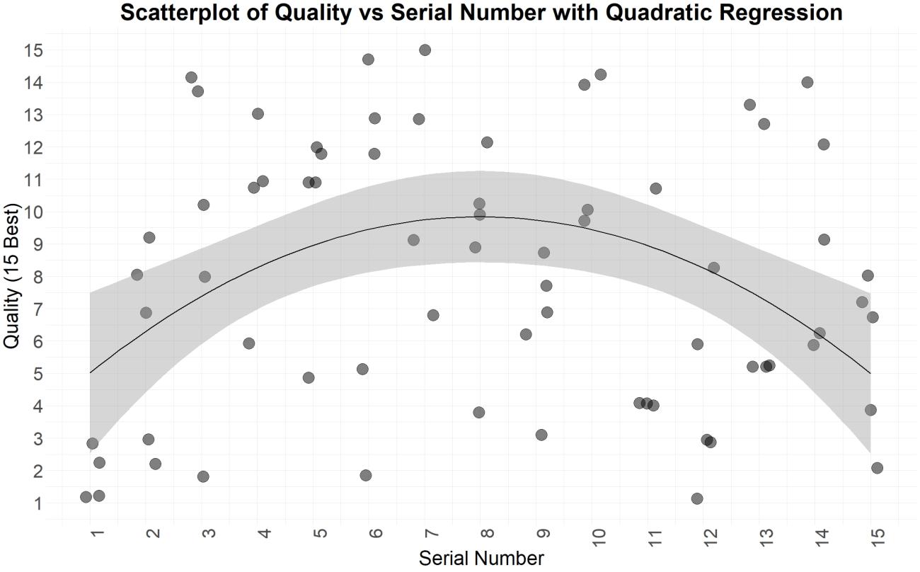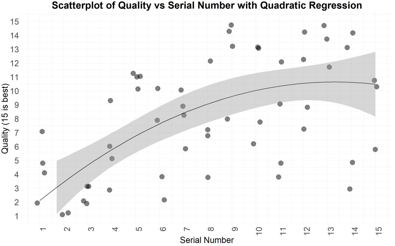 When analyzing the perceived quality, no linear correlation was found, with the correlation being only -0.001. However, the boxplot in Figure 7 shows a clear non-linear trend between serial number and perceived quality. A quadratic regression shows that there is in fact a significant parabolic relationship between the serial number and the perceived quality, as can be seen in Figure 8 and Table 1. This is a surprising result which indicates that the quality of the first few bracteates is relatively poor before gradually increasing to a peak, and then starting to deteriorate again. As this could potentially be due to random variance in the experiment, a second matrix was made, and another 15 bracteates were struck. The results, which can be seen in figure 9, support the finds of a non-linear relationship in which the first bracteates are of lower quality followed by bracteates of a higher quality. These finds directly contradict the assumption made by Axboe (Axboe, 1982) where he states that "It would seem likely that a goldsmith, asked for a single bracteate only, would strike it directly on a wooden or ivory die, while a series of 10 identical pieces would require, and justify, the casting of a bronze die". As demonstrated by this experiment, a longer series of up to at least 15 bracteates can all be struck directly on the wooden matrix.