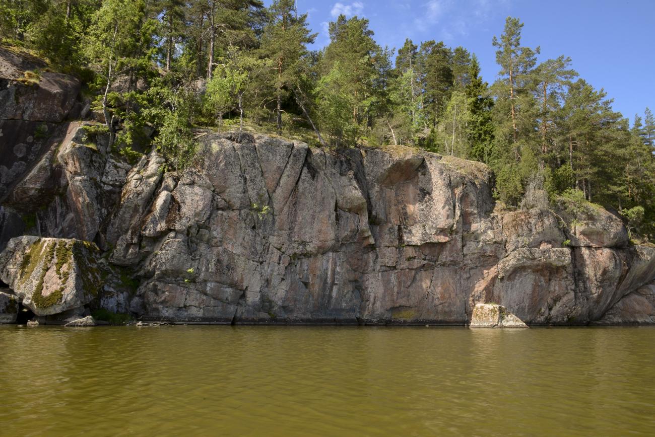 The Salmijärvi site can be considered a fairly typical Finnish rock painting site. The paintings, roughly date to the Neolithic period (5000-1500 BC), contain vague images of cervids, humans, and possibly waterfowl (See Figure 5a) (Lahelma, 2008, p.276; Luukkonen, 2021, p.402). The images are located on a flat vertical granite cliff, 1.8-2.2 m above the water, which indicates that the surface of the lake has remained more or less unchanged. The cliff is about 20 m high and 60 m wide (See Figure 5b). Horizontally, it curves into a slightly concave shape with paintings on both sides. According to recent acoustic measurements, both sides of the concave cliff effectively reflect sound, generating echoes whose audibility varies depending on the location of the sound source and the listener (Haapala, et al., 2023). At a distance of 20-44 m from the cliff the echo strength values (1000 Hz) are 1.2-2.5, which means that the echoes are clearly audible to modern people during speech and music performances (see Rainio, et al., 2024). At a distance of 20 m from the cliff, echoes from a sound source 10 m away arrive in 0.06 s. This means that the echoes are fast but distinguishable.
