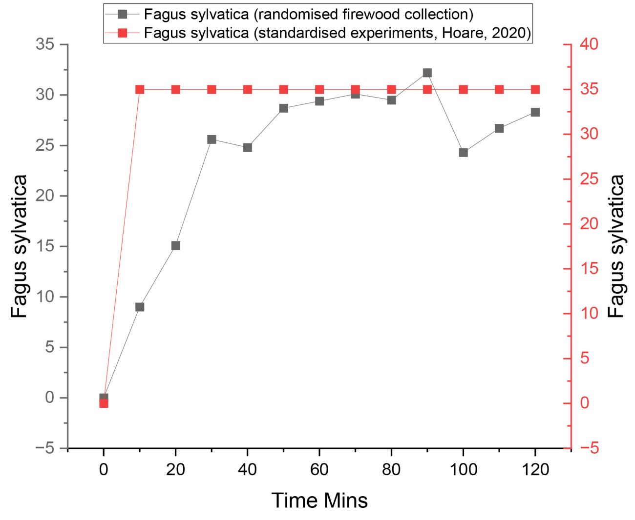 The fire was ignited at 6.00 pm and the measurements were recorded for 120 mins. There was no rainfall, and the wind speed was 0. The maximum temperature of the fire was 814°C, with an average of 590°C. The highest lux measurement was 24, with an average of 20.3 for the full 120 mins. Peak values recorded in Hoare (2020) were also 20.3.