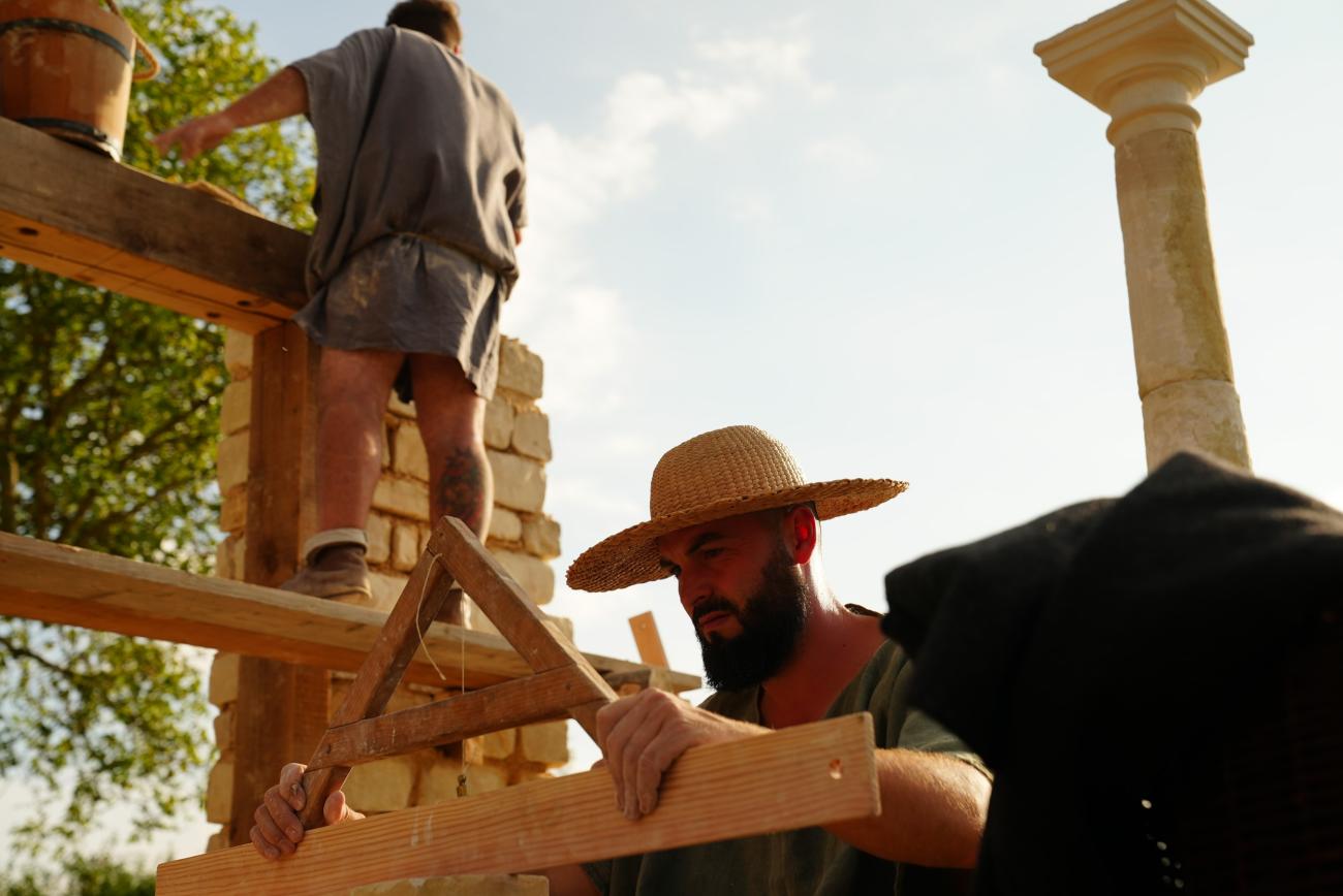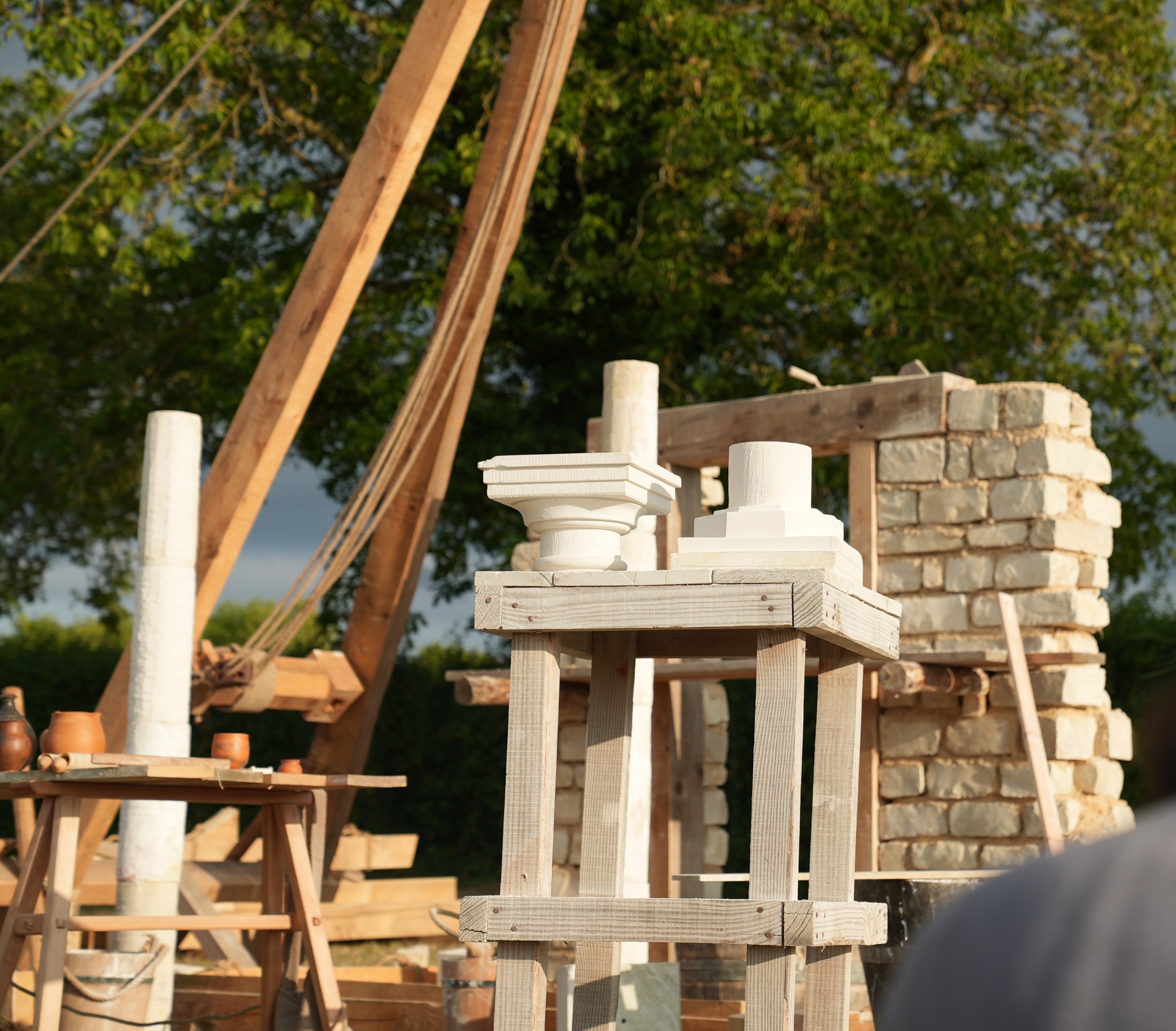 Two meters away from the wall, two columns were put into place, using the same rudimentary footing of wet sand as for the walls. These columns were carved from a finer grained limestone, also from the Saintonge area, specifically from the Thénac quarries, in operation since the roman period (Gaillard 2004). They comprise four slender drums, each 0.50 m high, varying from 0.18 to 0.20 m in thickness. They support two capitals, one of the provincial Tuscan order and the other one of the doric order (See Figure 2), which are prevalent at Alésia (Olivier 2021). These blocks were all carved with chisels and facing hammers, as well as turned on the lathe, except for the capitals. The stone-turning technology, well documented throughout the Roman Empire, is extremely frequent in Alésia. Indeed, nearly all the archaeological capitals and shafts display characteristic marks on the stone: circular grooves and ridges, as well as square mortises in the upper and lower ends of the blocks, used for inserting the lathe's mechanism (Gaillard et al. 2019; Revert & Brigaud 2022). On the topic of this specific technology, a paper was presented during the 13th Experimental Archaeology Conference in Torun, Poland (Revert & Brigaud 2023). Using the lifting crane, we could hoist the blocks and assemble the columns. Because of the added weight on such small bases of wet sand, the right-hand column leaned on the right, where the slope was the most noticeable. While this did not end in utter failure, it is certain that a more stable footing, or even foundations, are necessary for the stability of such supporting architectures.