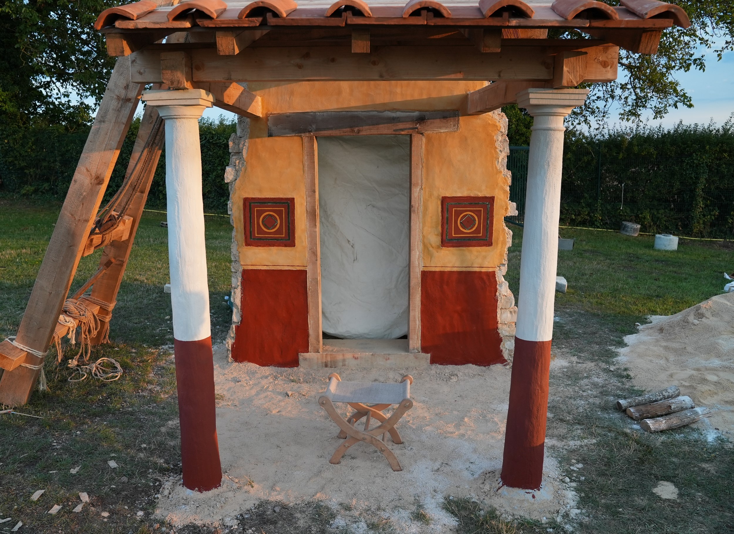 As part of our participation at the event, we wanted to create an experimental novelty around the project. This time, we would have to build an entryway and a small portion of a roman portico, such as can be found along the main road of the hilltop settlement. The portico needed to include two finished columns, supporting a full-scale carpentry, i.e. a semi-truss frame. The latter would receive a row of roman tiles, which would have to stay into place without any means of fixation, as was generally the case during the period. The entire building would then be plastered and painted, including minute geometrical decorations inserted in the walls. While it is possible that these porticoes would constitute roofed galleries, they would also have supported the upper levels of houses (see (Olivier 2021, 260‑61).