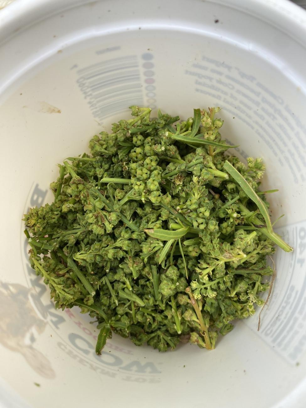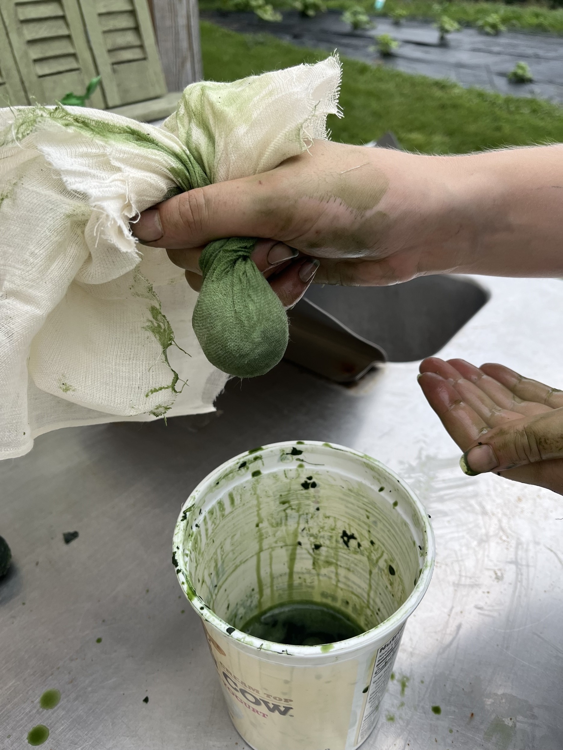 We also tried a method used to extract pigment from indigo. We filled a 5-gallon bucket with woad leaves then added water to cover the leaves. We left this outside for two days in the hot August weather (30 degrees Celsius) to ferment. We then removed the woad leaves, using butter cloth to squeeze all of the liquid out of the leaves, and then strained the whole liquid through butter cloth to get the rest of the chunks out. We then added 5 tablespoons of pickling lime and aerated the mixture by pouring it back and forth between 5 gallon buckets a handful of times. This method was unsuccessful, and we could not get a blue colour.