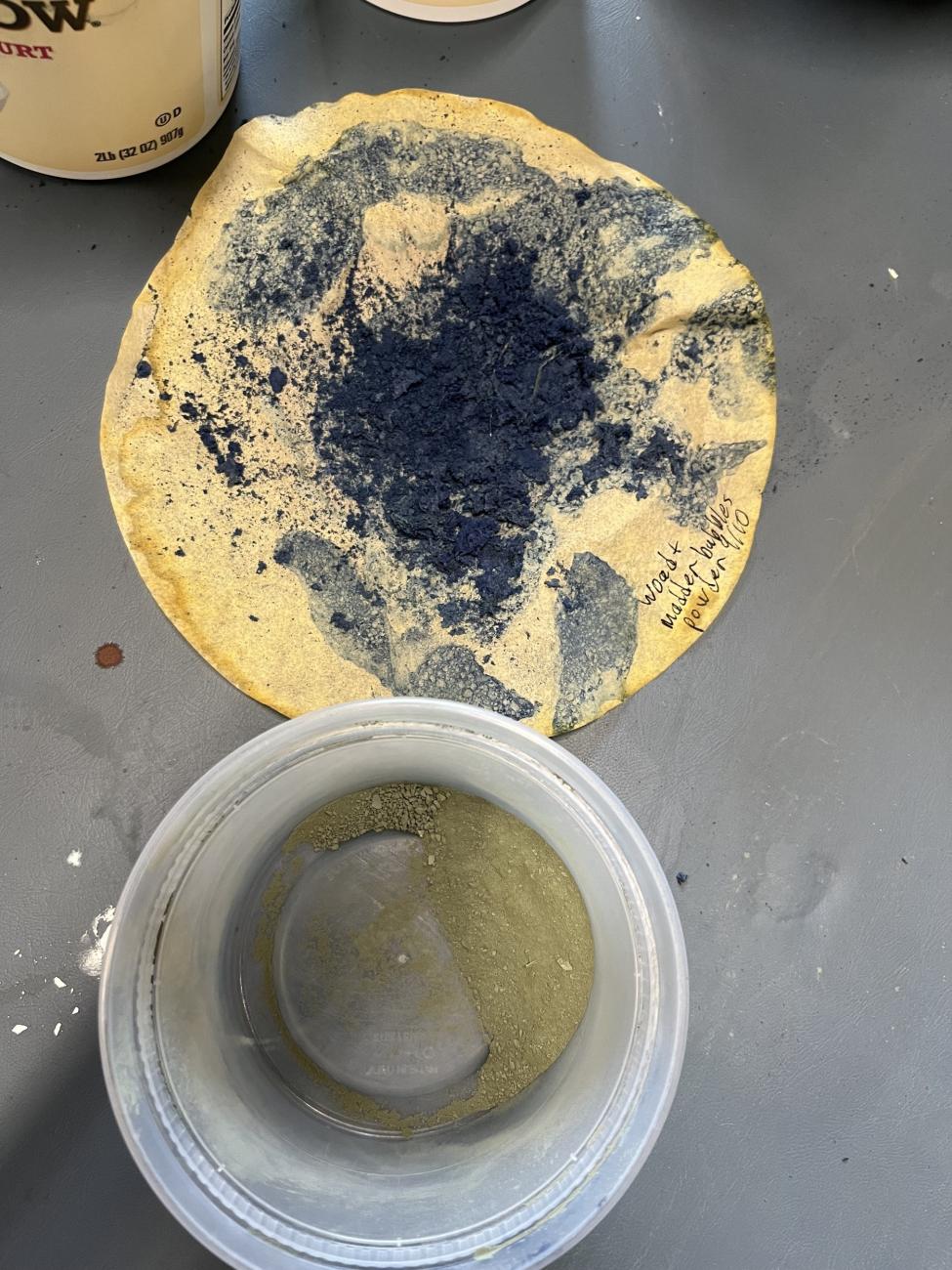 We attempted the process again when the weather was cooler (25 degrees Celsius), substituted pickling lime for Calcium Oxide, an ingredient also found in Roman concrete sometimes known as quicklime (Seymour et al., 2023), and increased the aeration time to 30 minutes and did get a blue colour. After aeration we decanted the liquid into large jars and let it sit overnight to let the pigment settle to the bottom. The next day we removed the liquid off the top so that we were left with just the pigment. This is a painstaking process with a straw so that it does not disturb the pigment and cause it to mix back into the rest of the liquid. We then spread the pigment over coffee filters suspended over jars to let the pigment to dry into a powder (See Figure 21). From this initial 5-gallon bucket full of fresh woad, we got a quite small amount of pigment that was more of a blue-green colour than a dark blue (See Figure 22). Like many other methods of dyeing with woad, this method required a great deal of woad and effort for a small amount of pigment but was relatively effective.