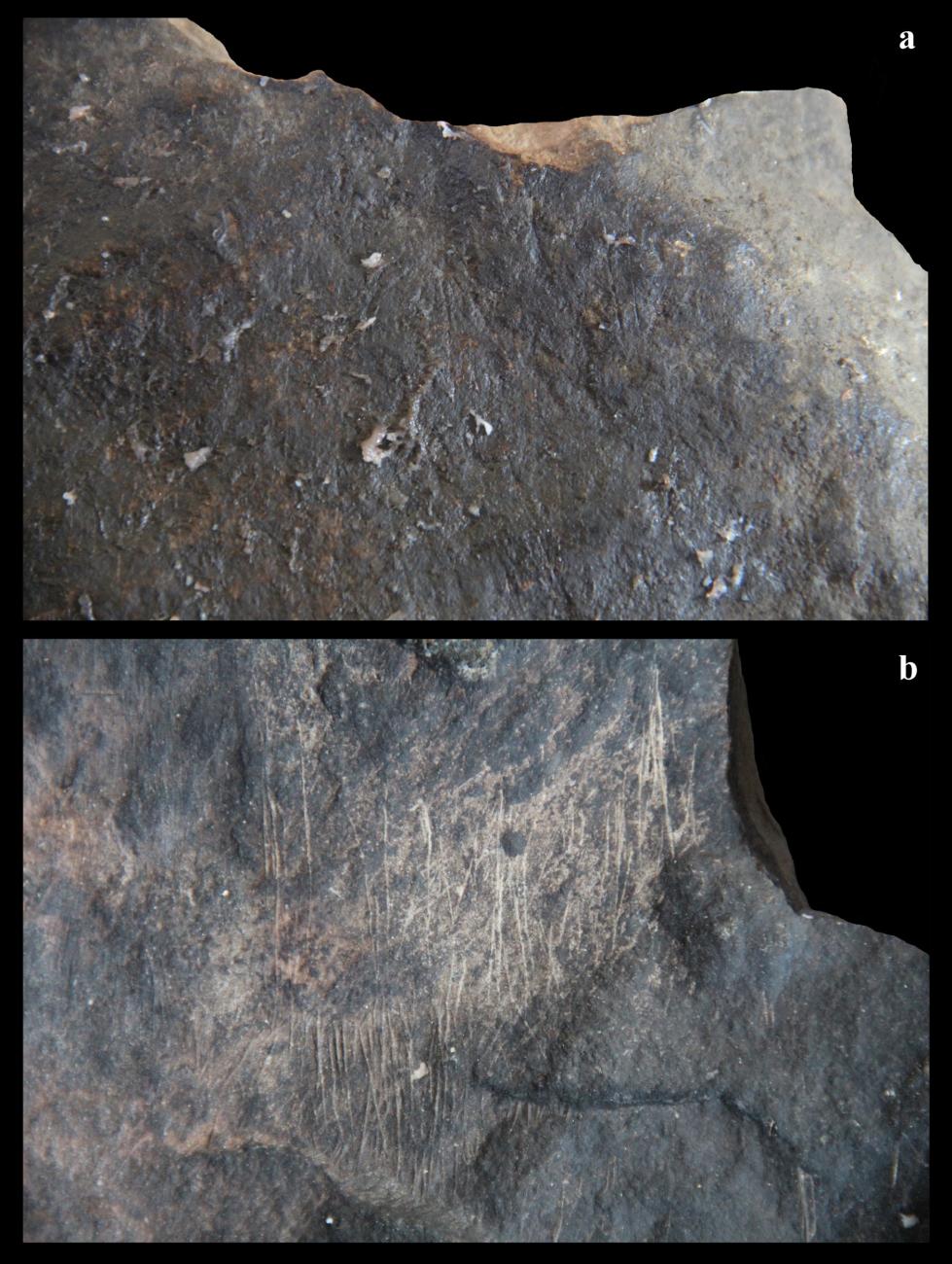 Most of the Mghvimevi engravings show a resemblance to the striations left by cutting activities. The grooves shown in Figure 22 present non-systematic, thin intersecting striations. These may be the result of utilitarian processes and, most likely, represent butchery marks.
