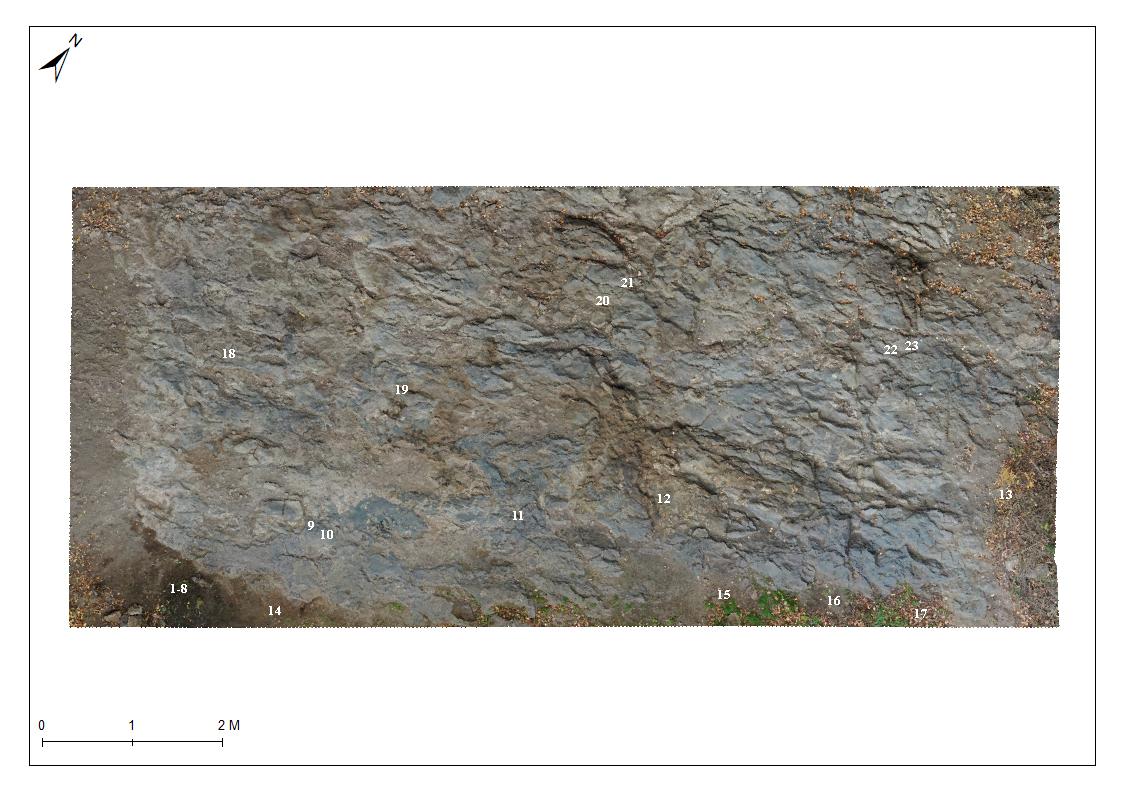 In 2022 and 2023, two fieldwork campaigns were carried out at Mghvimevi1 with the aim of rediscovering and studying the Mghvimevi petroglyphs. As a result, more than 20 engravings were documented on the limestone floor of Rock Shelter No.5 (See Figure 3). Upon close observation, all engravings were revealed to be linear, composed of vertical, horizontal, and diagonal lines - sometimes intersecting - ranging in length from 3 to 32 cm, with varying depths and widths from 0.1 to 0.6 cm (Zavradashvili, et al., 2023a; Losaberidze, Zavradashvili and Kenkadze, 2024).