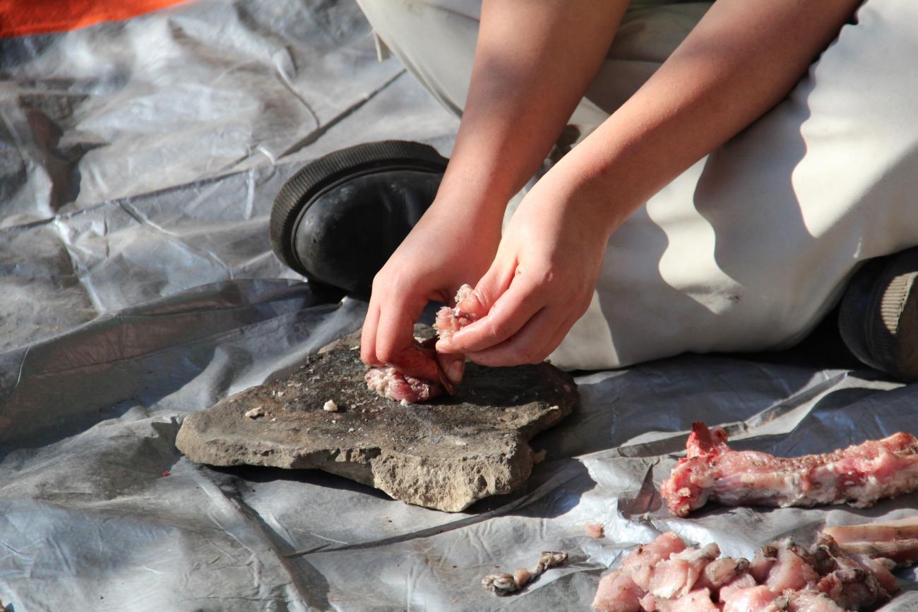 Cutting soft material (meat) on the rock board was performed four times, with variations in the type of flakes, meat material, and cutting boards. The movement of tools during cutting was not predetermined, as the experimenters used the flakes in the most practical and comfortable way for them.