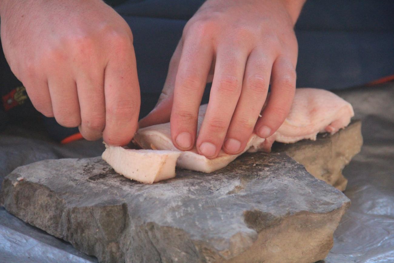 Three pieces of raw pork (weighing between 315 and 465 grams; measuring 5-10 cm in thickness and 25-40 cm in length) were cut on rock boards (Experiment No. 1, 5, 7). In one particular instance (Experiment No. 1), the pork was placed on an unworked rock surface and cut with an unretouched flint flake (See Figure 6). Upon completion of 11:10 minutes of cutting, the piece was fully divided into 35 pork cubes. Furthermore, two pieces of pork were sliced on previously scraped rock fragments (Experiment No. 3, 4) using the edges of unretouched flint flakes (See Figure 7). In these cases, 14 (Experiment No. 5) and 29 (Experiment No. 7) pork cubes were obtained in roughly that same amount of time (See Table 1 for times).