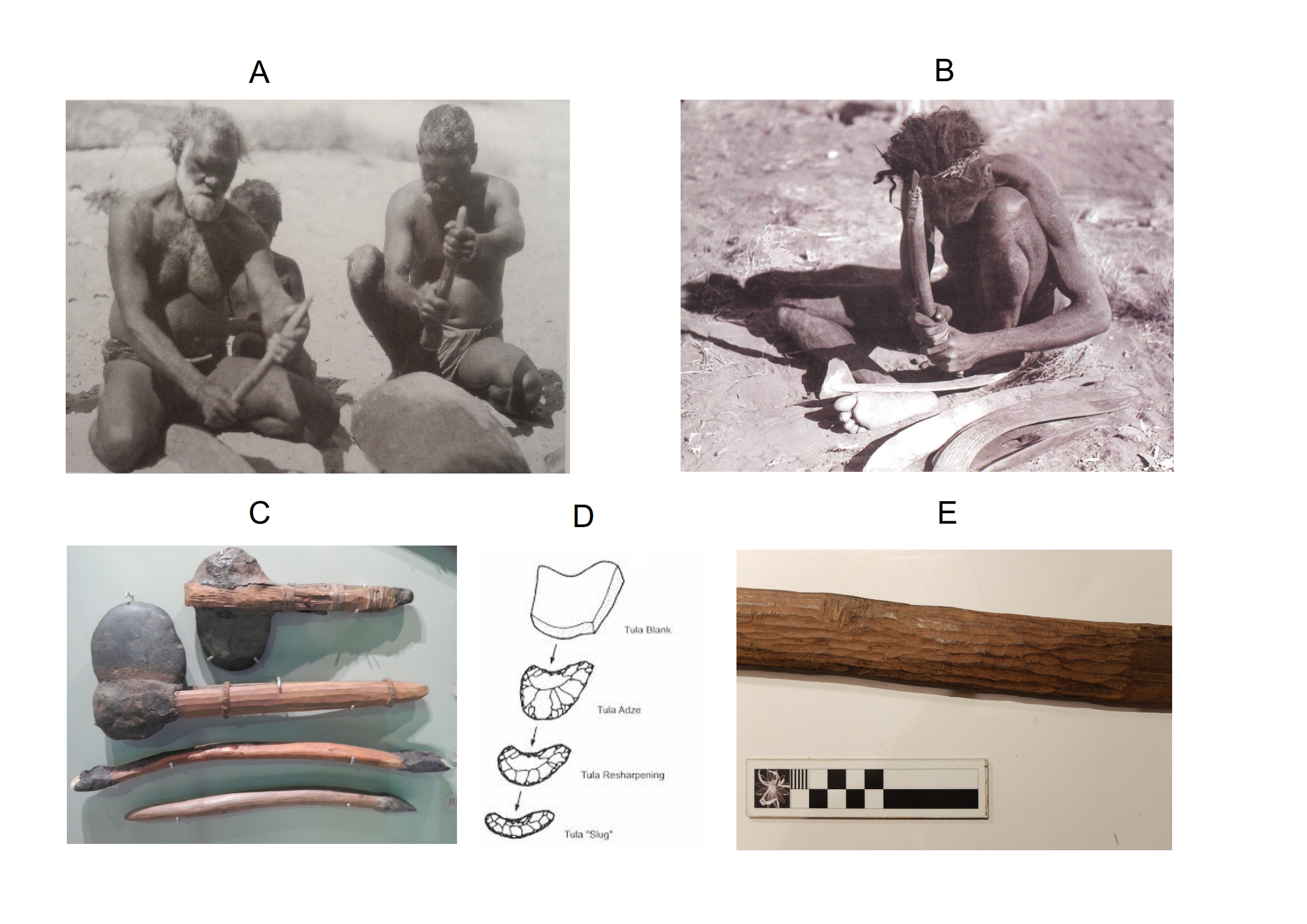 Flute manufacture in central Australia can be divided in two steps, initiation and regularisation: on throwing sticks, observation of unfinished fluted kylies/karli show that the fluting process for wide shallow flutes is directly linked to the adzing process to remove wood in the shaping (airfoil and thickness reduction) (Bordes, 2021). Adzes are composed of a handle made of strong and heavy wood with a specific scraping flake at their extremity named tula (See Figure 3C-D). On the Australian continent, older archaeological examples have been dated to between 3700 and 3500 years ago. Originating from central Australia, the use of this tool spread to Western Australia and South East Queensland (Mulvaney & Kamminga, 1999; Moore, 2004; Veth et. al., 2011). Consequently, it is not surprising to find these kinds of fluted patterns distributed in the same way as the use of the adze across Australia.