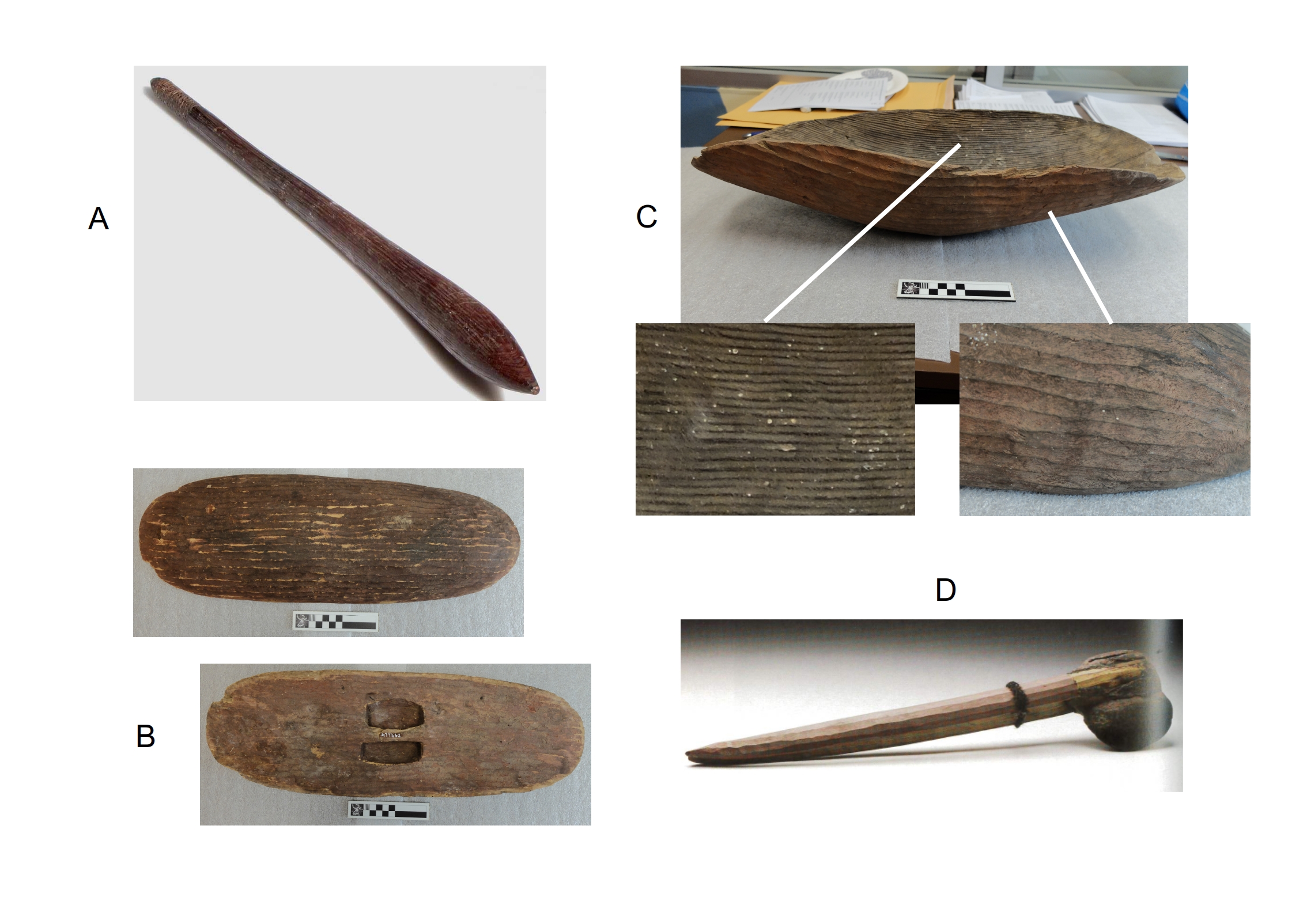 Some Aboriginal tools in Australia such as stone axes are fluted (See Figure 4D). Tapa threshers used in Oceania, to soften and elongate bark to create textiles, are grooved with narrow deep grooves which are distinct from fluted patterns on other previous artefacts. The known function of the grooves for these particular artefacts is to break bark fibres to soften it without damaging the bark (See Figure 1D). However, an apparent common point seems to be again the resistance needed for a heavy duty daily work.