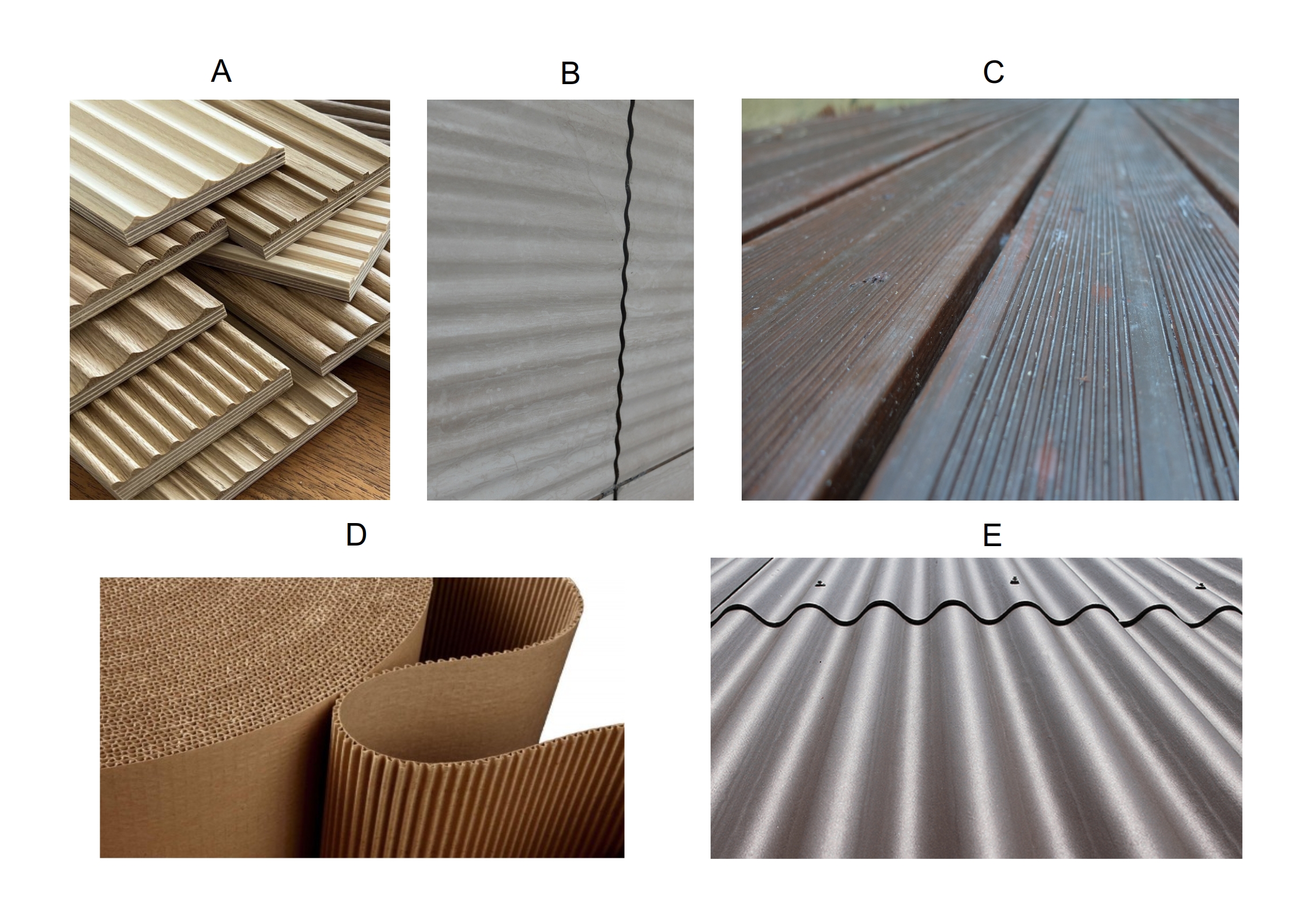 In the present day, this technology is used on wooden panels or on tiles for decorative purposes (See Figure 6A-B), but also to enhance their resistance to environmental exposure in industry. Indeed, it is now assumed that flutes and grooves prevent checking of exposed deck boards (See Figure 6C). An interesting result for wooden decks is the increasing limitation of checking with the narrowing and depth of grooves but an increasing of the cupping effect relatively to wider, swallower flutes (Cheng, 2016; Heshmati et al., 2018). Avoiding cupping on throwing sticks might explain the choice of wider, shallower flutes on these implements over the narrow grooves. This also could be an explanation of the existence of different fluting profiles on wooden artefacts in Australia (narrow or wide flutes) and on other continents. Furthermore, it might explain the presence of wide flutes on the external surface of coolamon containers with narrow fluting on the inside surface where checking could be more critical and cupping deformation not an issue. However, we need to remain cautious with the results of such modern studies applied on highly transformed European wood (i.e., Douglas fir, western hemlock, white spruce) which would need to be investigated more in detail on hard dense acacia raw wood used for aboriginal implements. Apart from wooden panels, fluting is used nowadays on cardboard for packaging (See Figure 6D) and on metal roof covering (See Figure 6E) which still contributes to a better resistance to shock without increasing the thickness of the material that would negatively affects its flexibility (cardboard) or its weight (roof covering).