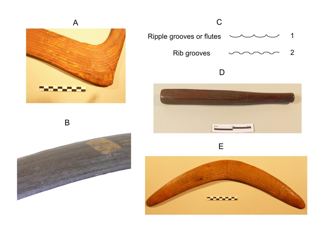 In central Australia, different type of throwing sticks are grooved: The most famous being the kylies (See Figure 2A) and wirlkies2 (See Figure 2B) from the central desert region, which have been diffused through almost all the continent (Davidson, 1936; Jones, 1996). Such a grooved pattern is characterized by 3-5-millimetre-wide shallow flutes (ripple profile) with a 0.2-0.5 millimetre depth, resulting in a density of 2-3 flutes per centimetre, with narrow parts and extremities having a denser pattern. The wideness of these grooves leads them to be classed as flutes or ripple grooves. No symbolic function for this feature has been revealed from ethnographic studies (Jones, 1996). The recognised function of the flutes on kylies of central Australia include the production of rhythmical scraping sound between two throwing sticks (McCarthy, 1961) in addition to their use as clap sticks (Van der Leeden, 1967).