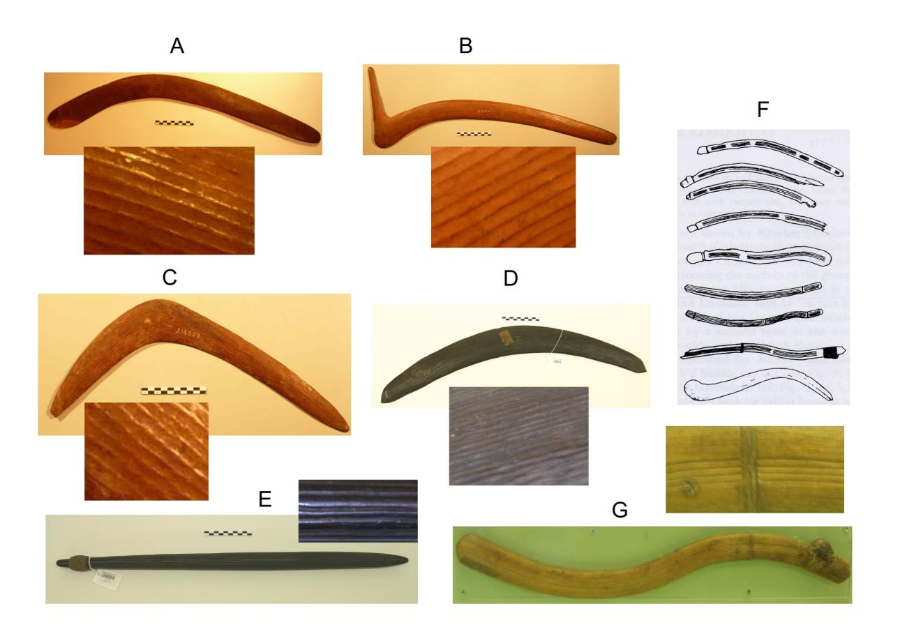Some fighting clubs with double pointed conic extremities from Southern Australia are fluted (See Figure 4A), and some light types can be used as projectiles. Their circular section does not generate enough aerodynamic lift to get any benefit from surface fluting as observed by Nelson. However, they are a weapon designed to received high impact damage from fighting and have a high resistance requirement. Club handles are sometimes also lack grooving in the same way as the handling blade of the kylies of central Australia and probably for the same reason.
