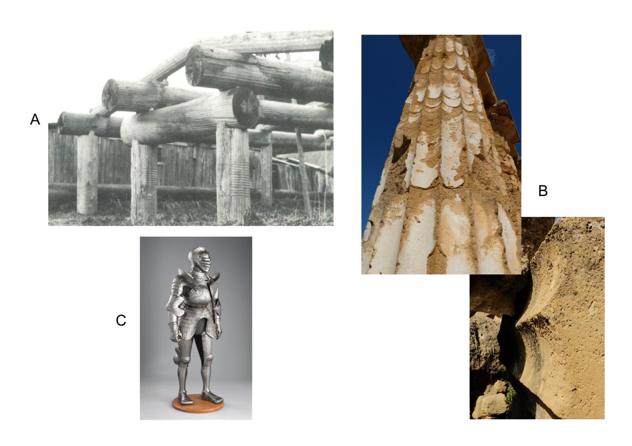 Among the elements of architecture, stone Greek Doric columns are fluted (See Figure 5B). This feature is known to originate from archaic wooden columns which were also shaped by adzing, so the fluting could have arisen from a function linked with the original wooden material. However the property of fluting is still valuable on stone material as the classic Greek Doric columns have been observed as more resistant to stress and stiffer than ones with flat surfaces (Kourkoulis and Moupagitsoglou, 2009).
