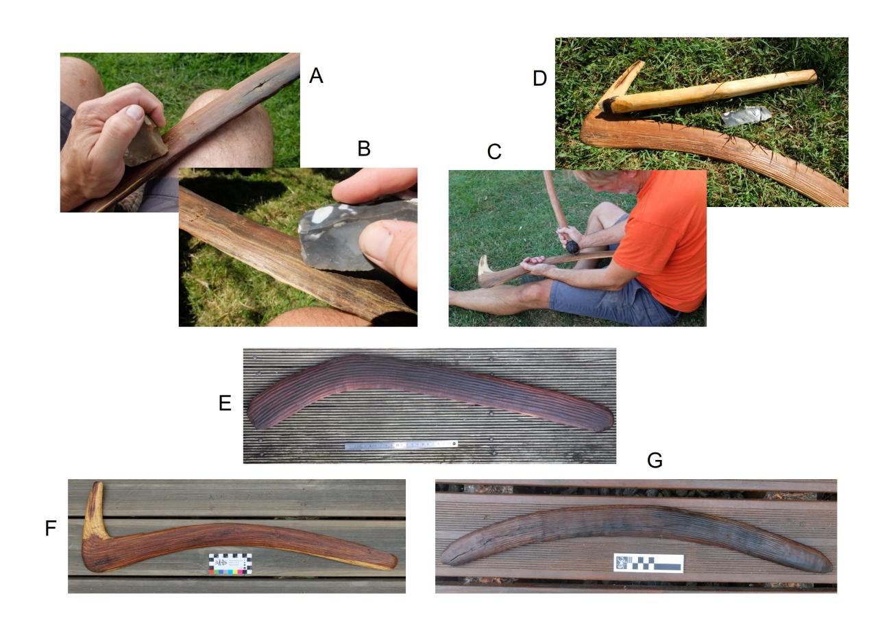 As achieving the fluting by the alignment of adzing strokes is a difficult skill, and would need a long training, the fluting for our experiment was done following the second technique used in Australian Queensland region for narrow flutes: A first step of shaving to smooth the surface before a second step to initiate narrow grooves with denticulate flake used as a saw. These were finally widened and regularized to modify them as flutes with a metal or a stone adze (See Figure 7A-D). In this experiment, we focused on wide flute as found on kylie and wirlki throwing sticks (See Figure 7E-F). But another type and narrow flute pattern has been manufactured as a replica of a crescent shaped throwing stick from Queensland (See Figure 2D, 7G).