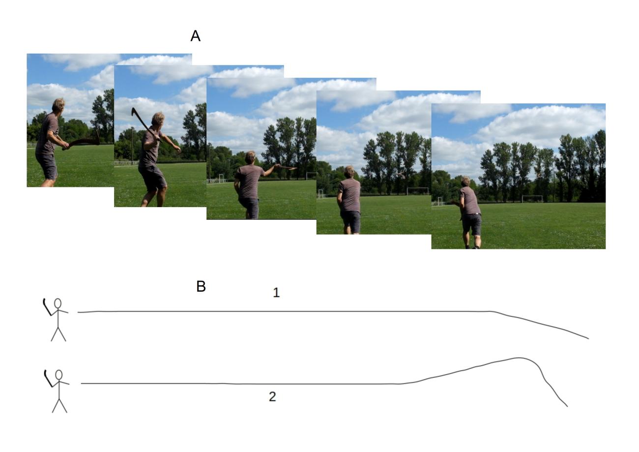 Several informal throwing tests with replicas of kylies and wirlki, which are traditionally fluted, show that this feature has little influence on the maximum range reached of these projectiles. However, for this research, two specific replicas were tested before fluting and after fluting to check these first observations in depth. A kylie replica reaching a maximum range of 100-110 m, was been tested without any fluting and the flight behaviour observed (See Figure 7E) (AU38, table1). A general observation is that the aerodynamic lift of throwing sticks tends to increase at the end of their trajectories, due to high rotation and speed. Also, depending of the blade tuning, a climbing effect is frequently observed at the flight end. This deviation lowers the accuracy of these projectiles for ground hunting, which is the main function of kylies and wirlki traditionally fluted in the central desert region of Australia, which are not meant for bird hunting and folding unlike their lighter counterpart and boomerangs. This climbing deviation was observed without the fluting (Fig 8B(2)). The effect of fluting observed during experimental session with the same long range kylie replica shows that this climbing deviation is attenuated and that the trajectories of the projectile tend to stay closer to the ground and straight which is beneficial to the accuracy and efficiency of throwing sticks in the final phase of their flight (See Figure 8B(1))(AU38m, table1). Explanation of this fluting effect, in keeping the trajectory, could be a drag effect of the flutes, decreasing the aerodynamic lift, and preventing the climbing deviation, in contrast to the role of these features concluded by Nelson (Nelson, 2001). Another experiment was carried out with a heavier short range wirlki without fluting made by a wanambi aboriginal man at the Al Currung community (named George), and purchased in 2018 (See Figure 7F) (AU54, table1). This original wirlki was fluted and tested in the experiment. Considering that the wirlki rotation is slowed because of its greater weight, the additional thickness at the extremity of its short blade and the presence of the additional hook, this throwing stick is shorter ranged than the tested kylie, and follows a straight and low trajectory. A final climbing deviation was not observed, because the aerodynamic lift is not sufficient on this heavier projectile to produce such effect. The test with the same wirlki but now fluted, first on extrados only and secondly with both sides didn't change anything in the flight trajectory, and kept the same range (Fig8, A) (AU54-1, AU54-2, table1). This observation tends to confirm that the fluting is not playing any major role in increasing the aerodynamic lift on this wirlki replica and that the benefit for a heavy throwing sticks is negligible. However, it might add drag to prevent climbing effects in the terminal part of the trajectory for lighter, long range projectiles. On the other, hand some of the tests (AU11a, AU60a, table 1) obtained a slightly longer distance for some fluted replicas, but this seems to be more in relation to the loss of weight by wood removal than any specific aerodynamic effect of the fluted pattern. Another observation from the test with Au60a (table1) is a slight accentuation of the rotational whistling of the projectile with both fluted surfaces, but this effect is not consistently obtained for other tested fluted throwing sticks, so this probably depends on other factors.