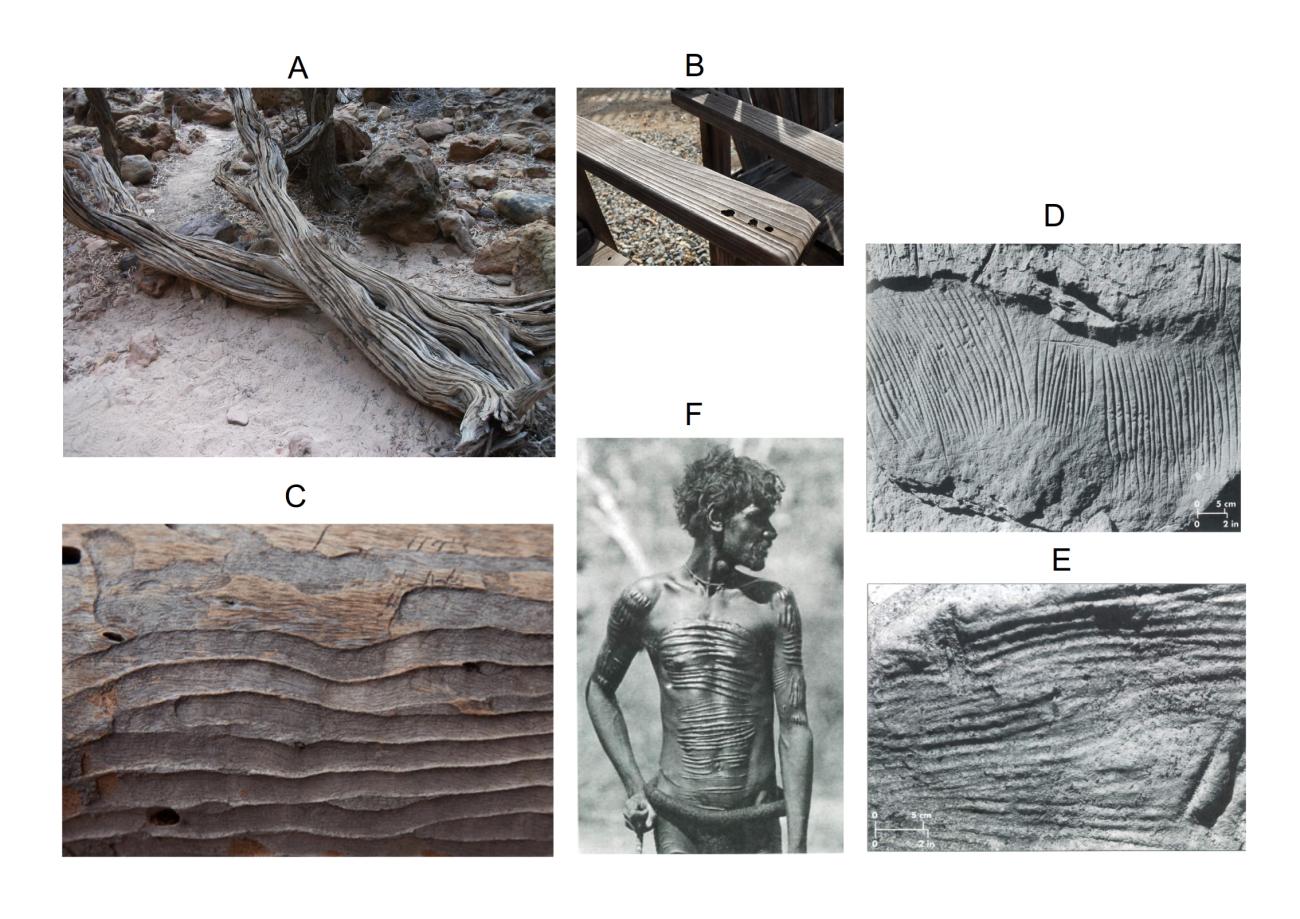 The natural aesthetic improvement obtained by fluting or grooving of a whole surface of an object, might have been a factor in its propagation independent of other practical functions. This aspect might have played also a role in the human invention of fluting/grooving by imitating natural features in their environments and the making of fluting on wood surface might have been influenced by the observation of such natural fluted and grooves surfaces. In the arid zone of Australia, it is possible to observe this natural grooved feature on old drying wood (See Figure 9A). Sunlight can also play a role in creating fluting patterns from natural exposure of wooden objects to UV light, as is possible to observe on old garden chairs composed of pine planks. In this last case, one explanation of this fluted pattern could be the faster photo degradation of wider softer spring wood rings (early wood) than on narrow autumn harder wood rings (late wood) (Kudela et al, 2024) (See Figure 9B). Fluted patterns can also be caused on eucalyptus trunks due to burrowing insects ((See Figure 9C).