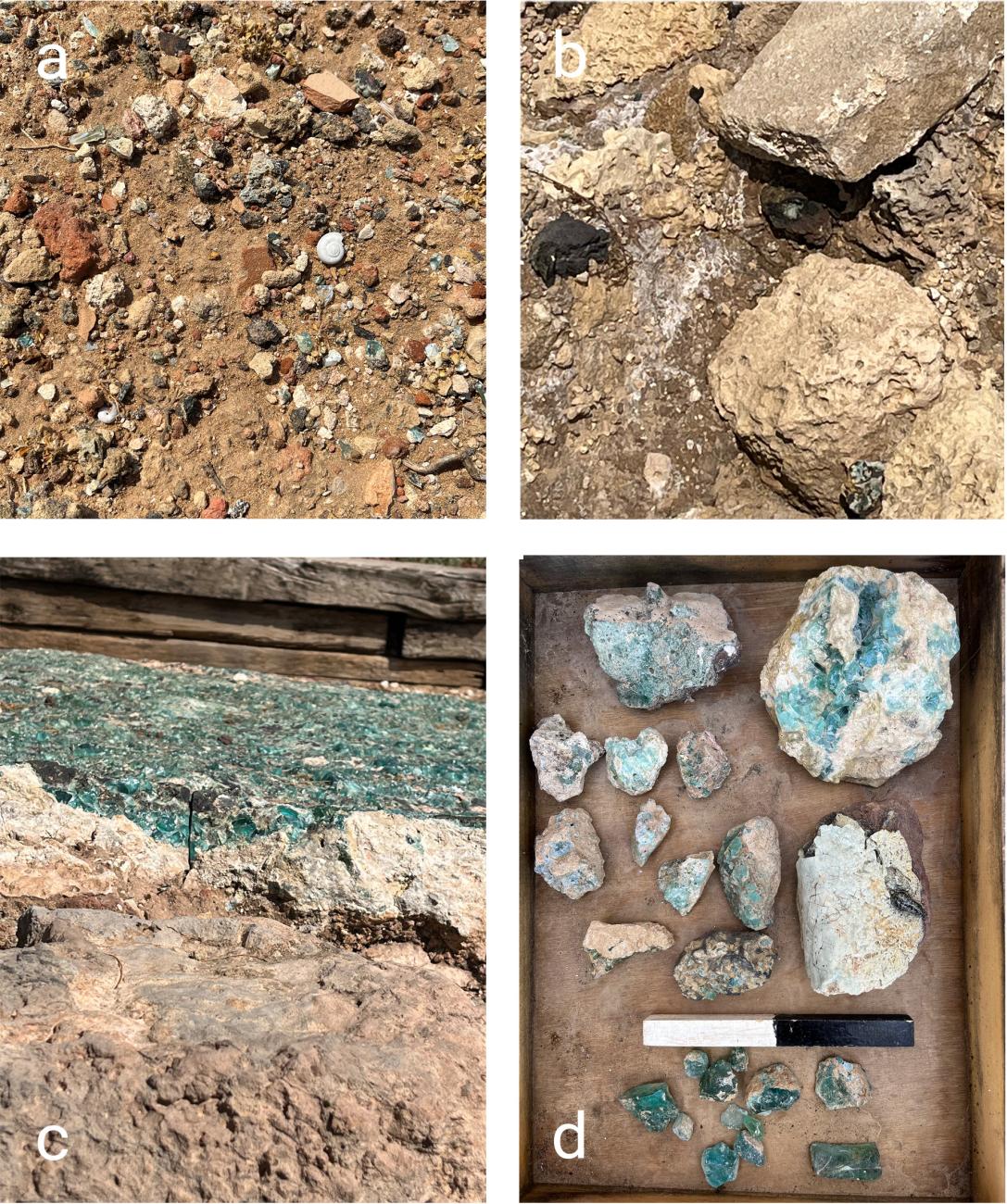 The abundance of small chunks of raw glass and furnace building material debris across the site’s surface is apparent nowadays to its visitors (See Figure 1a). Furthermore, excavations have repetitively revealed in almost every area of excavation the use of primary-raw glass as building materials embedded in walls of many of the post-Byzantine structures (See Figure 1b). This phenomenon is visible within the perimeter of the fortified medieval site and especially in Crusader buildings of its town and the walls of its castle. During the Late Byzantine period, primary glass production remains were also documented as having been used as fertiliser in the agricultural plots surrounding the site, where they were found in refuse disposals together with discarded pottery, fragments of glass vessels, animal bones and other finds (Tal, 2020, p.35).