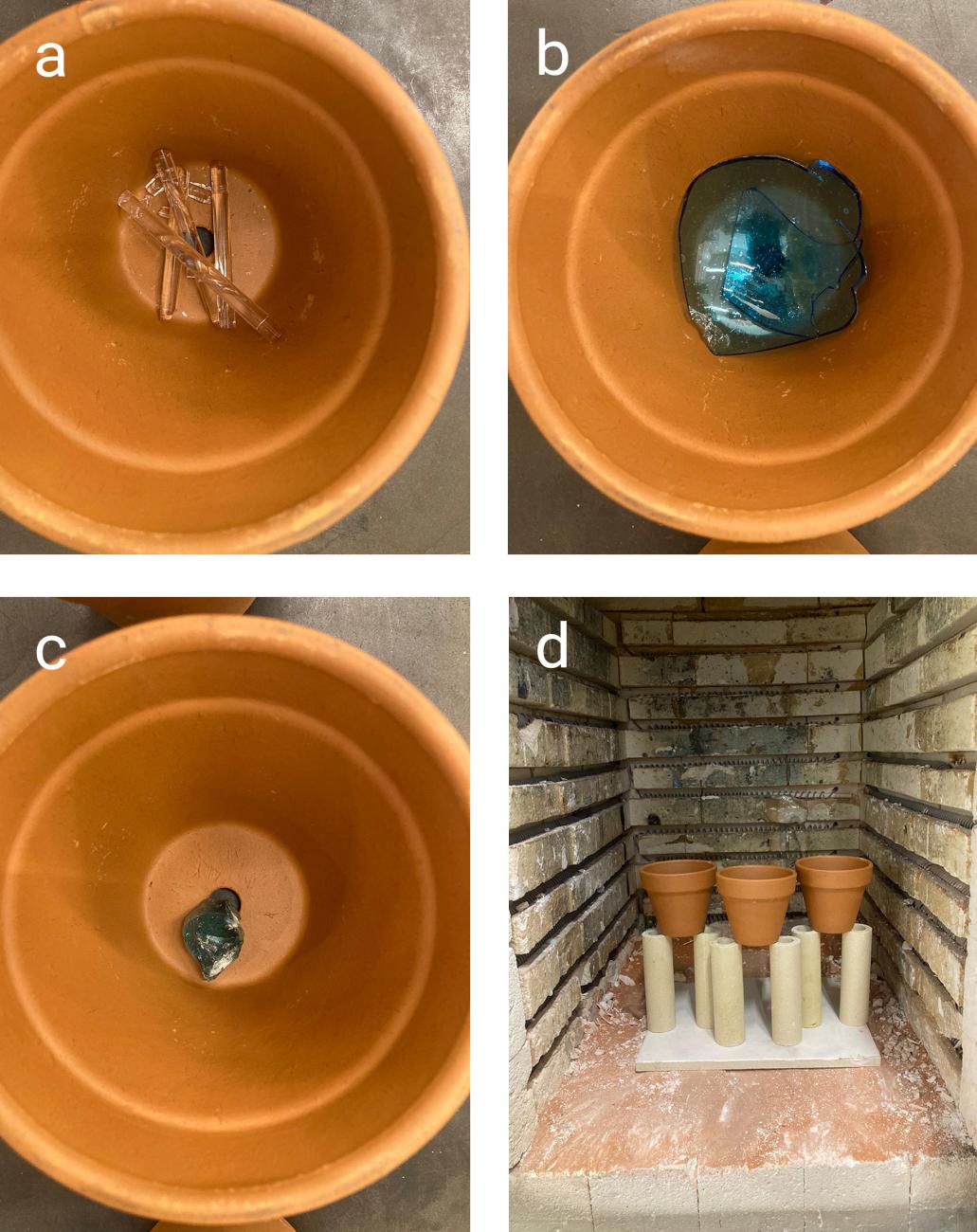On the other hand, the glass chunks that had been attached to furnace building materials were extremely fragile and almost impossible to work with. Therefore, only a few pieces detached from the building materials were usable. Among these chunks, some impurities were noticed, which seem to have caused breakages throughout the working process. When working with a flame with these chunks first time, they remained whole and did not break; however, any attempt to further manipulate these worked glass chunks with the flame created a chain of breakages.