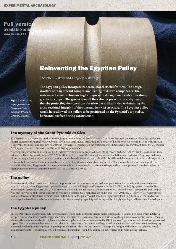 Reinventing the Egyptian Pulley, by Stephen Blakely and Gregory Blakely, proposes a possible solution to moving heavy stone blocks in the building of pyramids. They propose a theoretical Egyptian pulley and test it practically, both in prototype and full scale.