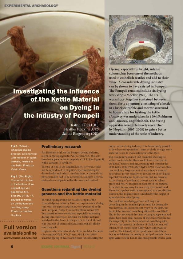 The article, Investigating the Influence of the Kettle Material on Dyeing in the Industry of Pompeii, by Katrin Kania, Heather Hopkins and Sabine Ringenberg presents the results of experiments concerning the importance of metal used to manufacture dyeing kettles in Pompeii.
