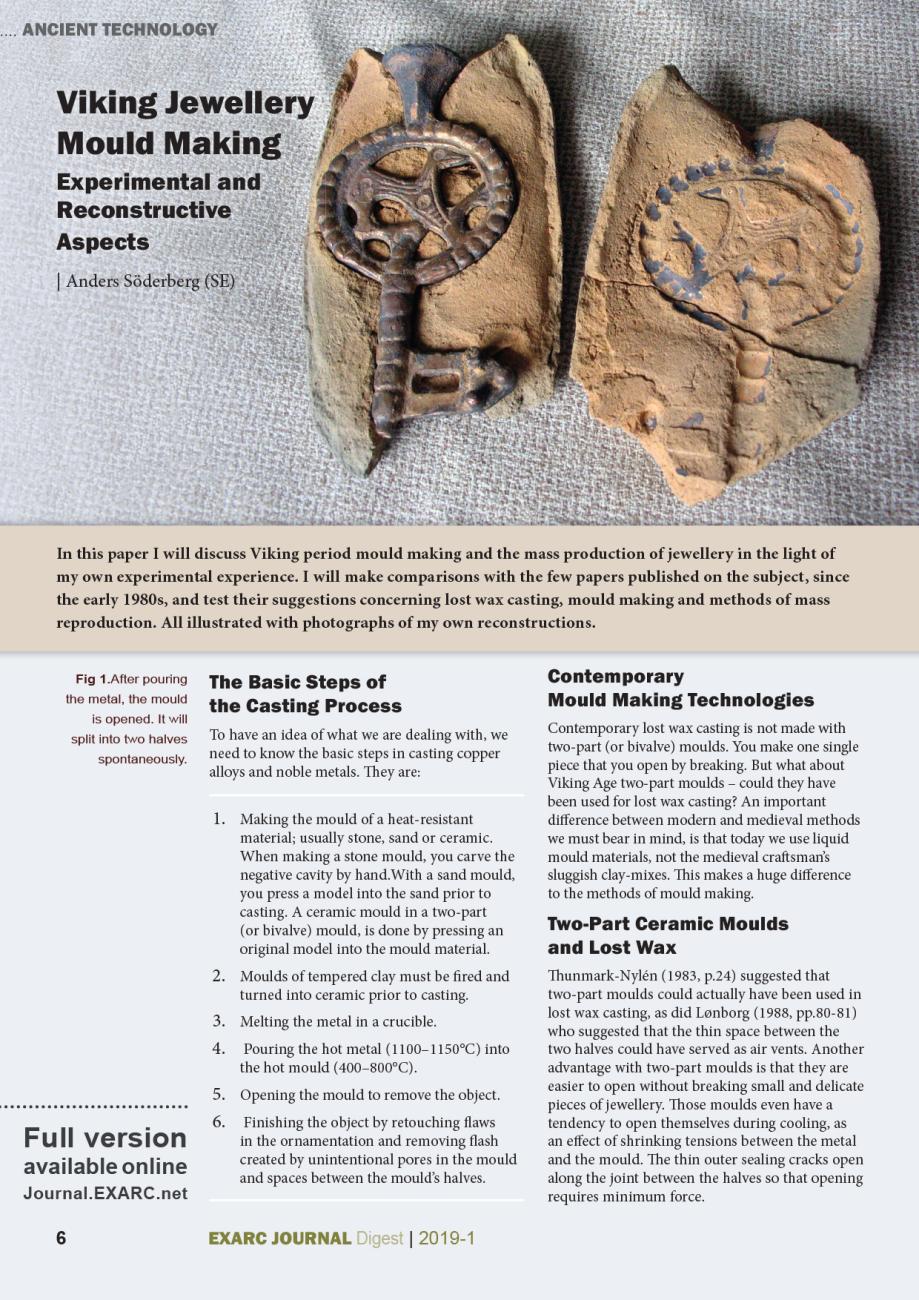 The last two issues of our Journal received many interesting articles of which only a few can be sampled in this Digest. The articles range widely from an insightful article on Viking Jewellery Mould Making by Anders Söderberg through to an exhaustive overview of pottery techniques in Bronze Age Europe with suggestions for further experiments by Caroline Jeffra. In between there is an article outlining the detective work needed to interpret two 14th century mead recipes by Susan Verberg. The personal favourite of our Editor-in-Chief was Experimental Archaeology in the Scottish Highlands by Susan Kruse. This article introduces a series of experimental archaeology workshops organised by Archaeology for Communities in the Highlands which combined archaeological experiments with educational activities. Not only did they attempt and succeed in reaching audiences who might otherwise not be interested in archaeology, they are also making what they learned further available through videos and loan boxes.